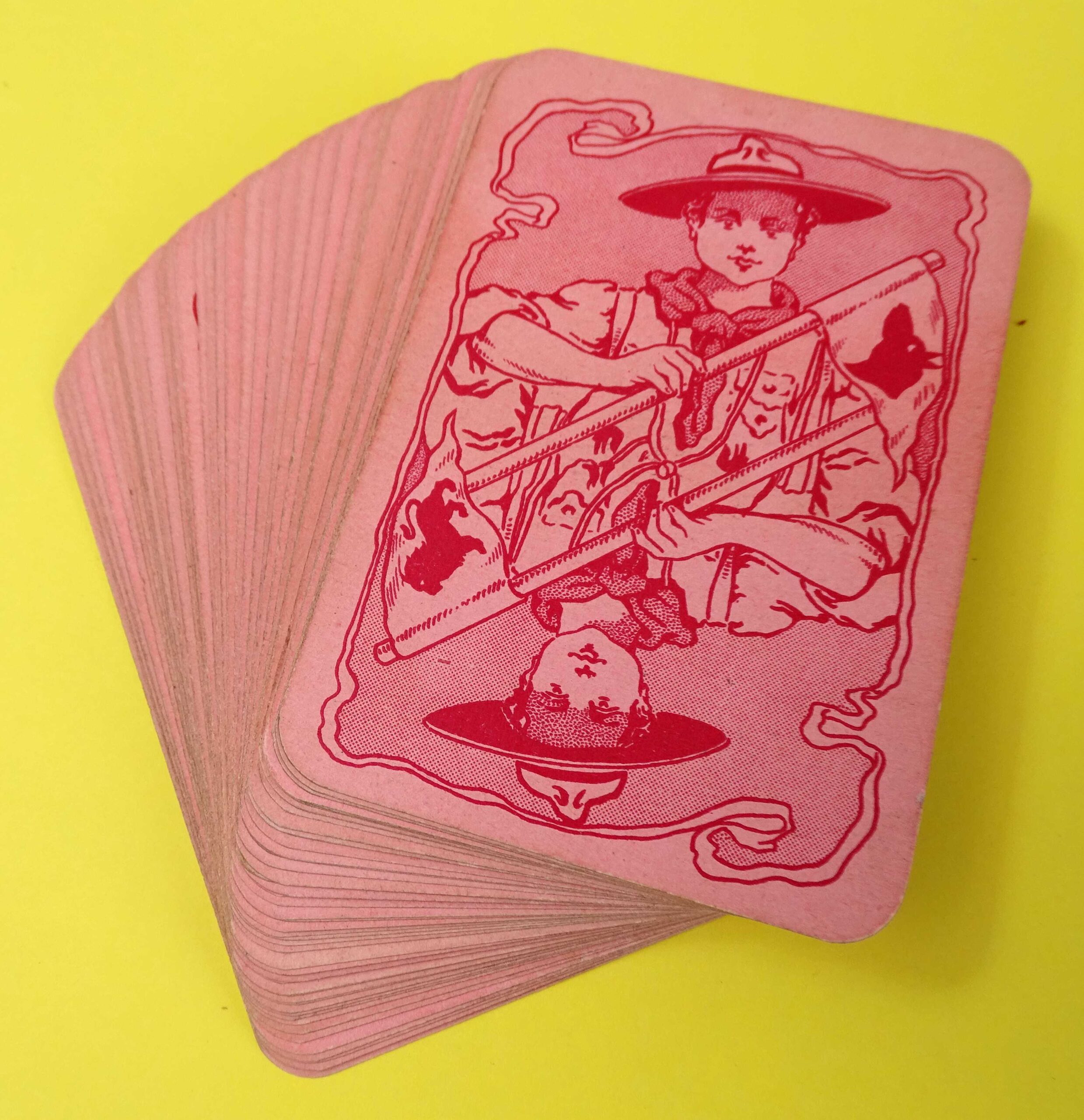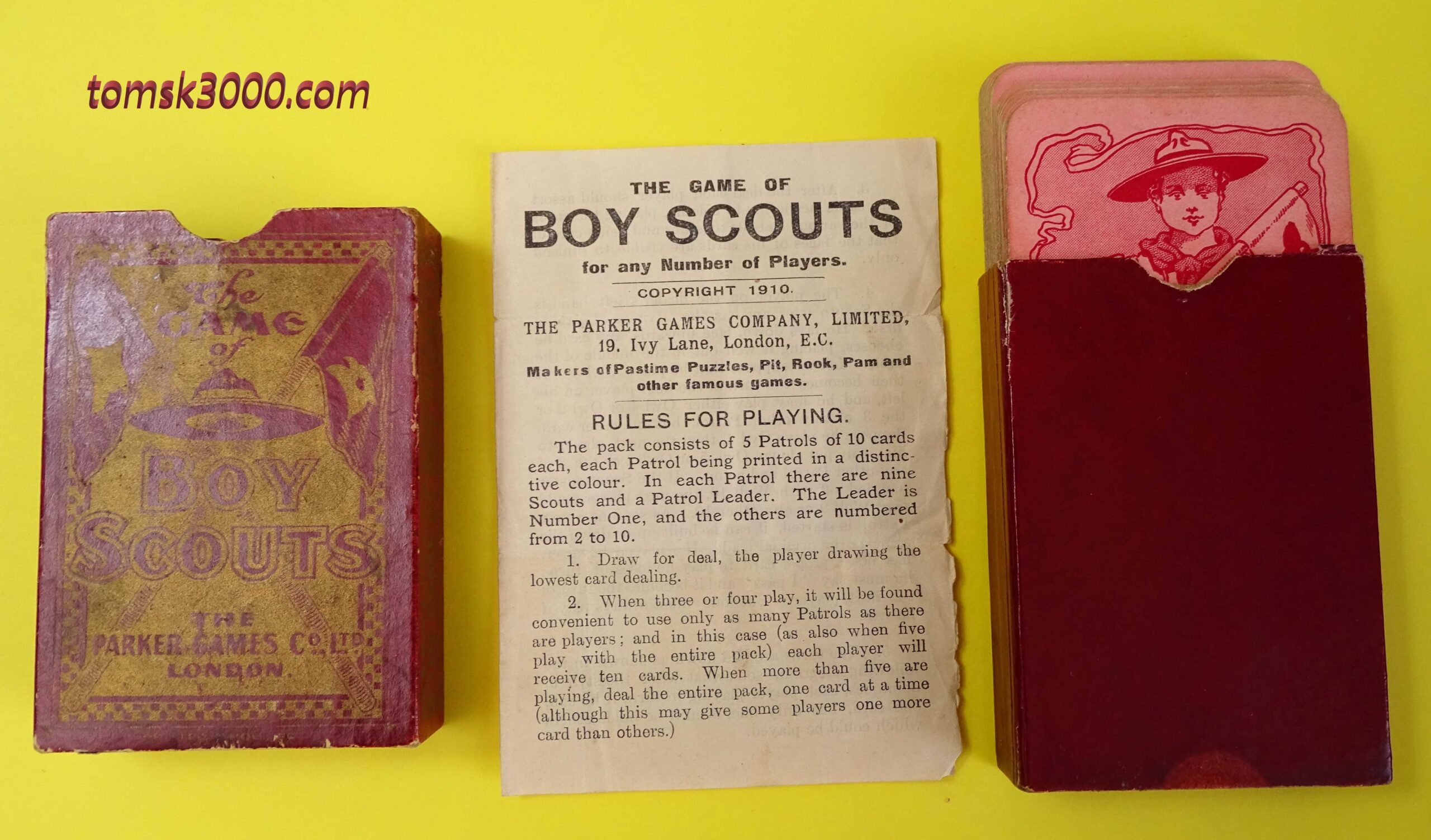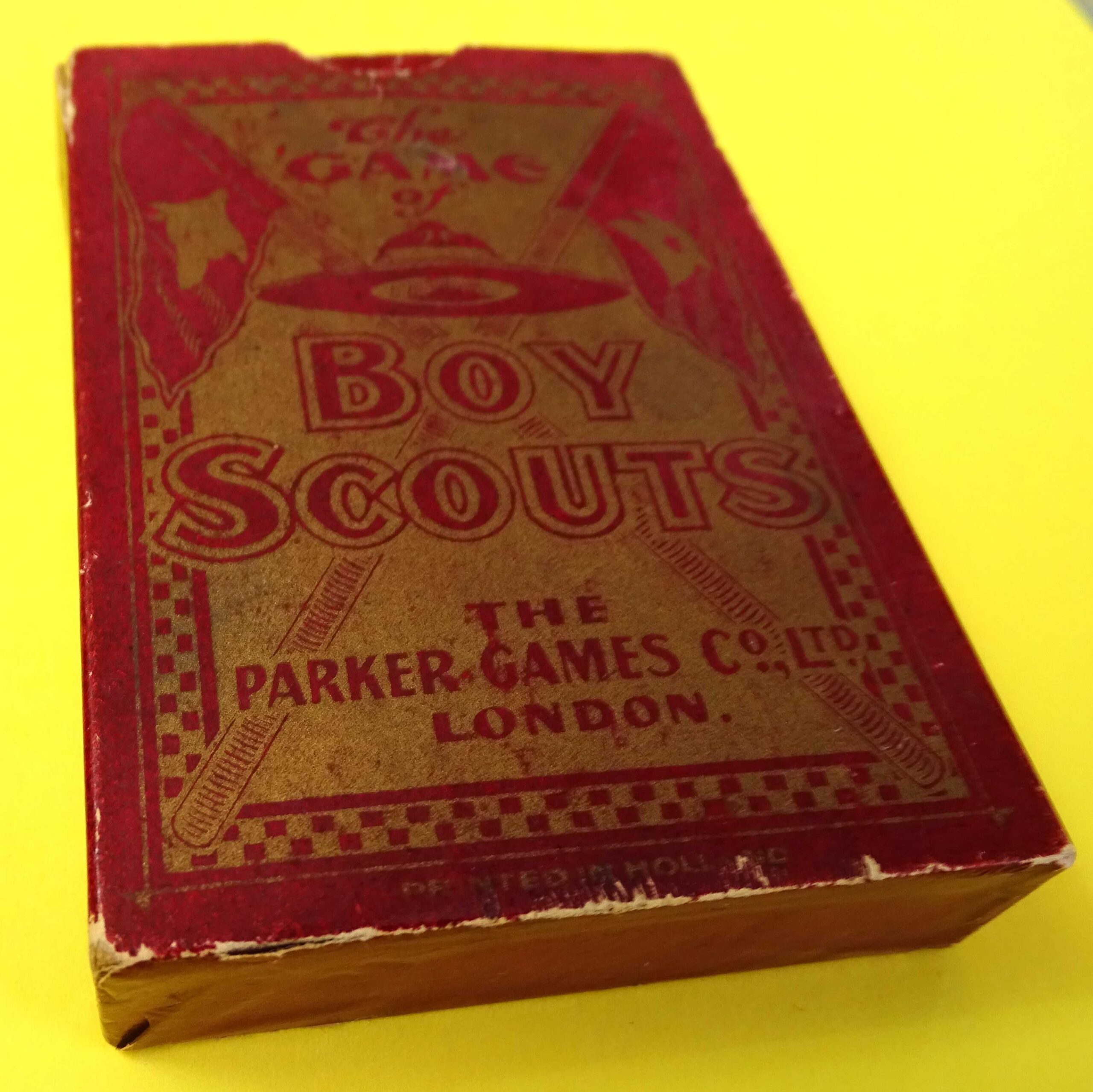 A wonderful, complete example of the “Boy Scouts” card game, published by Parker Games Co. Ltd., London. This rare 1st edition of the game was published in 1910 at the dawn of the Scout Movement and the same year that the Scout Association was formed here in the U.K. The game is complete with a full deck of 50 cards and the original instruction sheet. Miraculously the two piece, sleeved box has also survived in relatively good order.