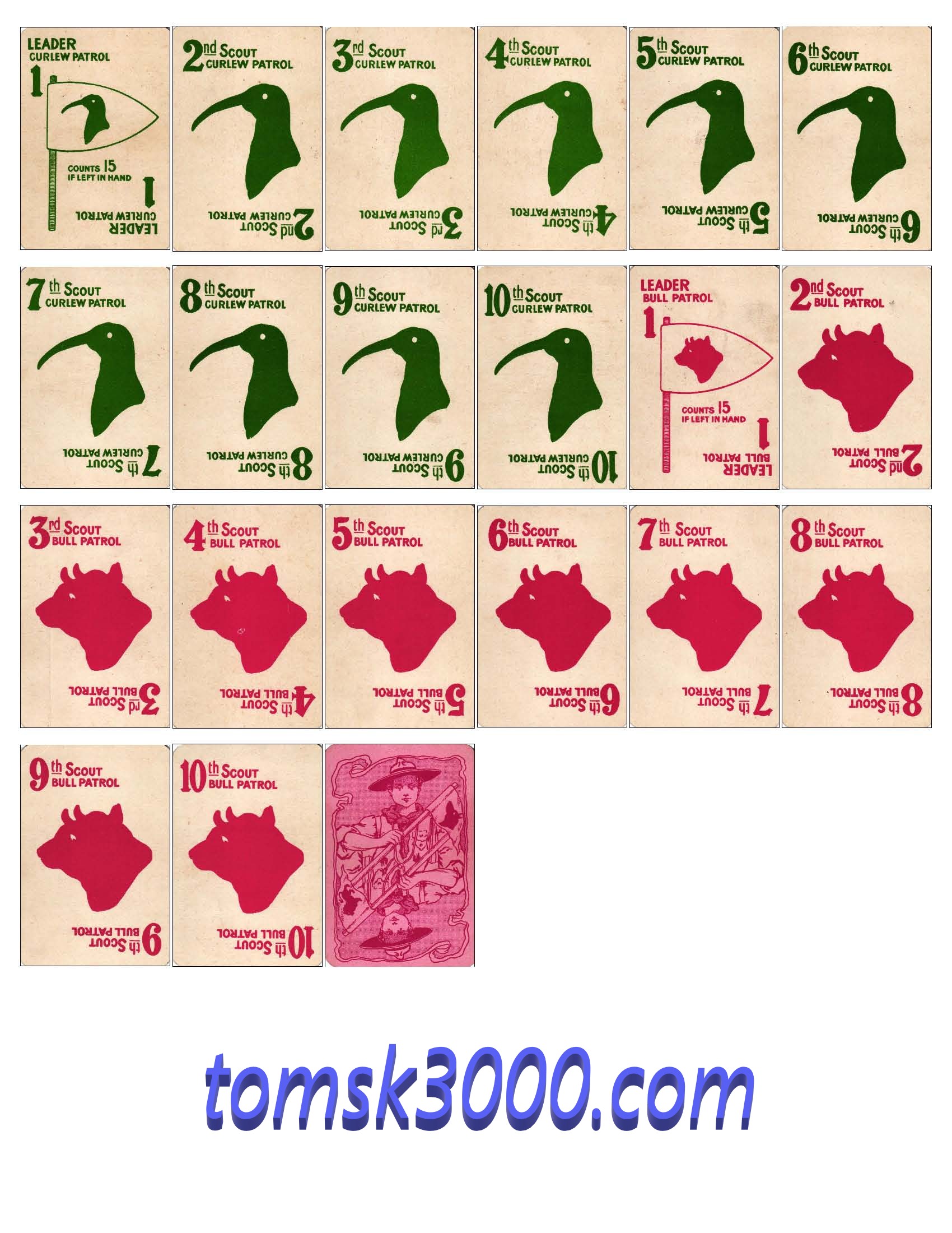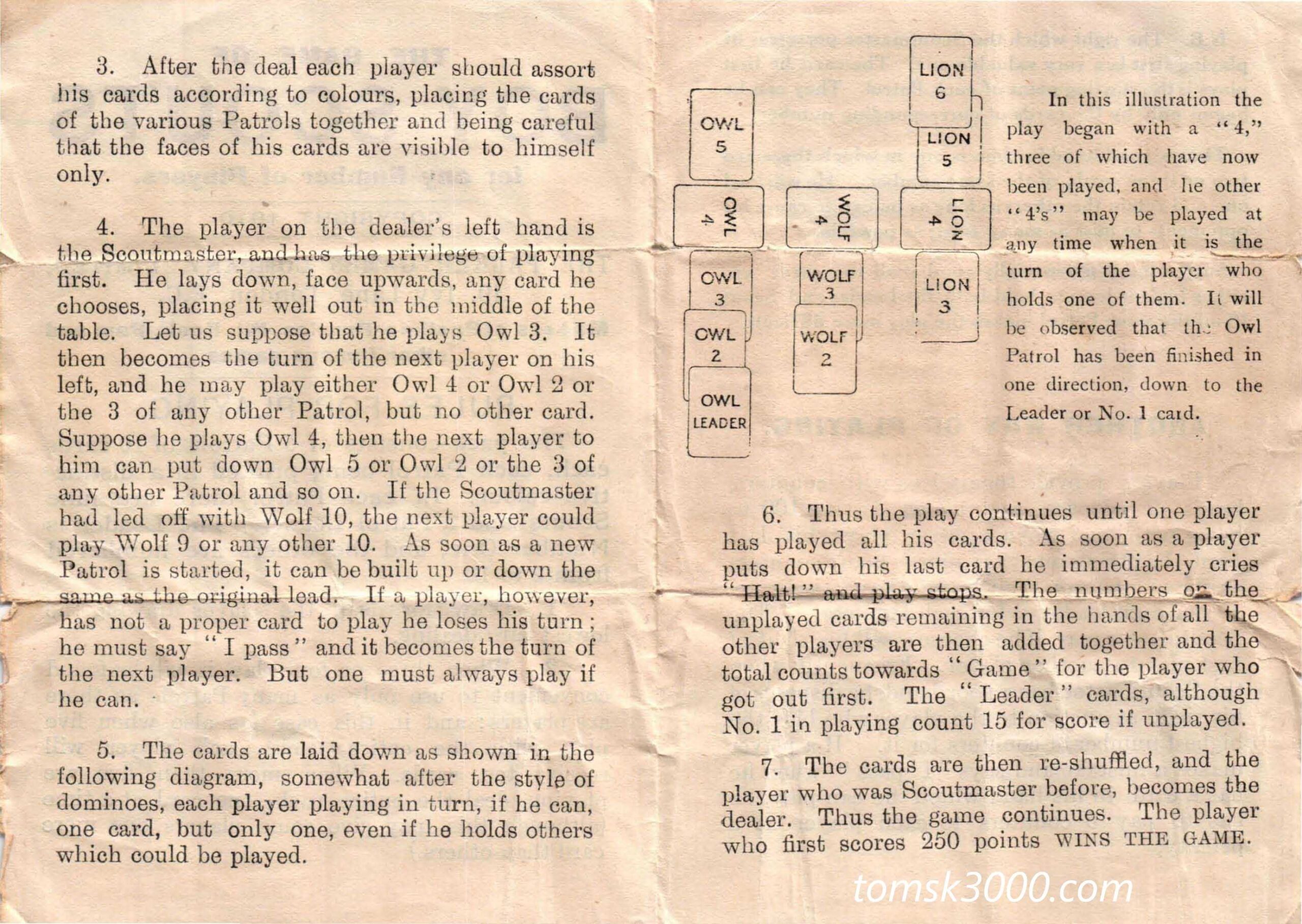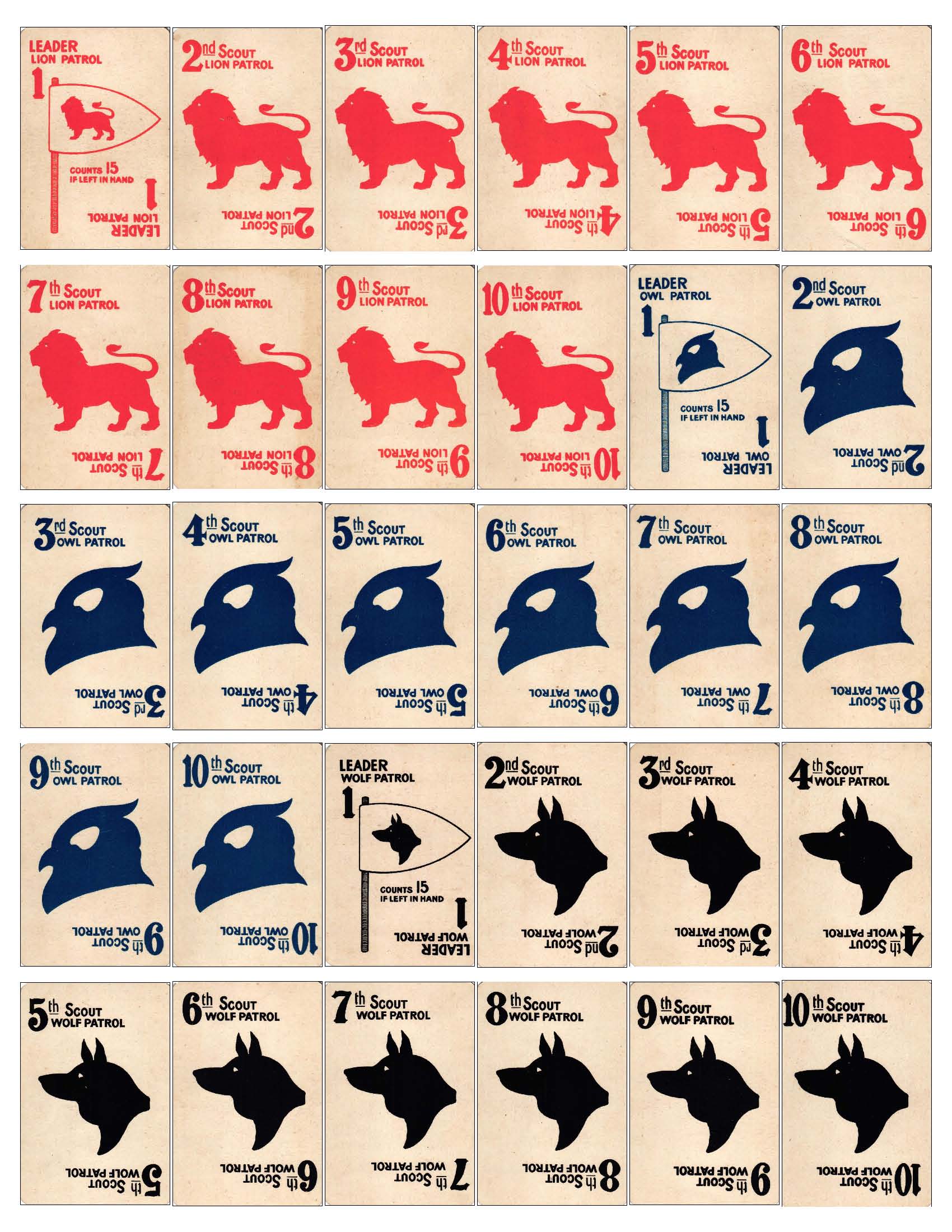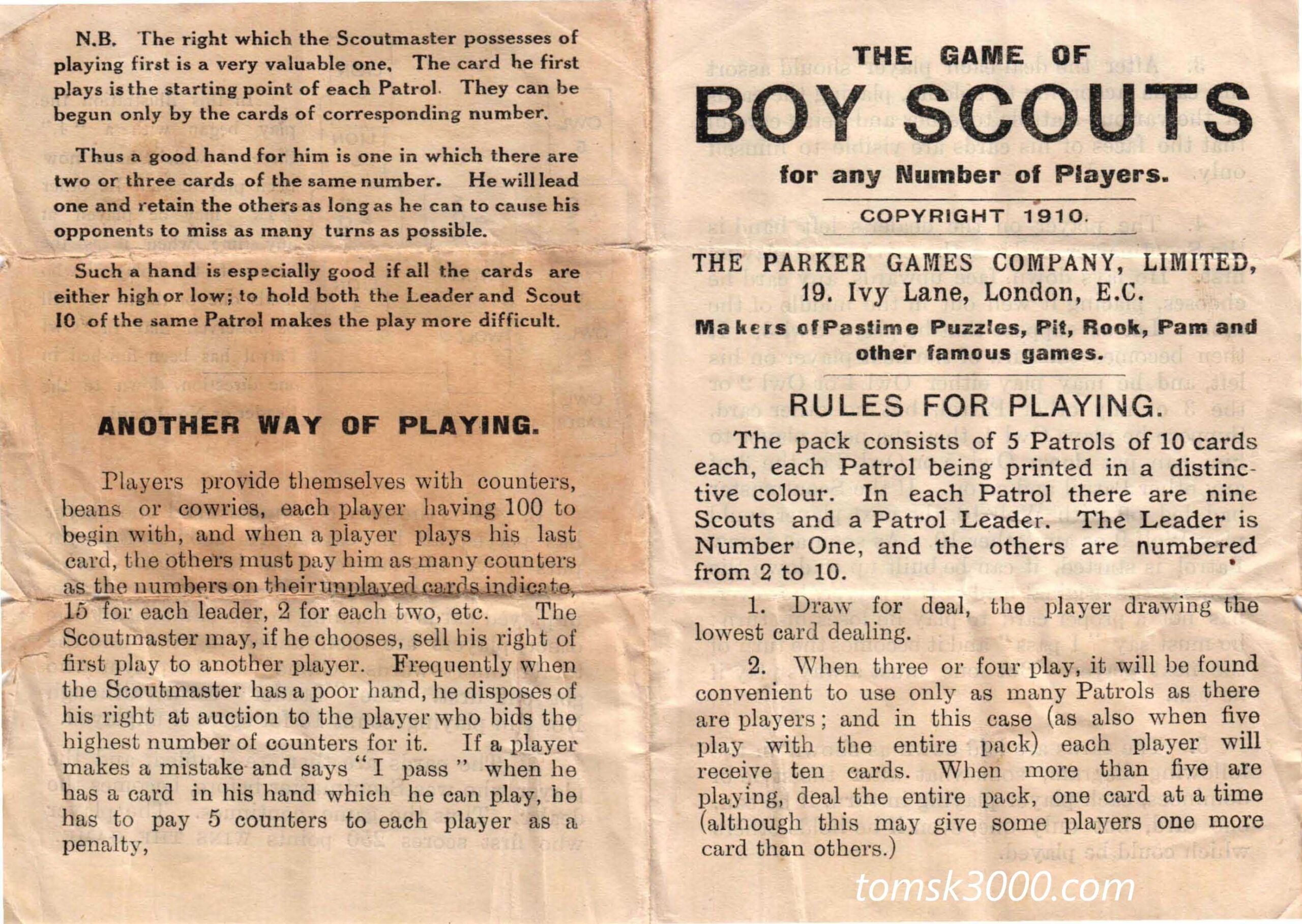 A wonderful, complete example of the “Boy Scouts” card game, published by Parker Games Co. Ltd., London. This rare 1st edition of the game was published in 1910 at the dawn of the Scout Movement and the same year that the Scout Association was formed here in the U.K. The game is complete with a full deck of 50 cards and the original instruction sheet. Miraculously the two piece, sleeved box has also survived in relatively good order.