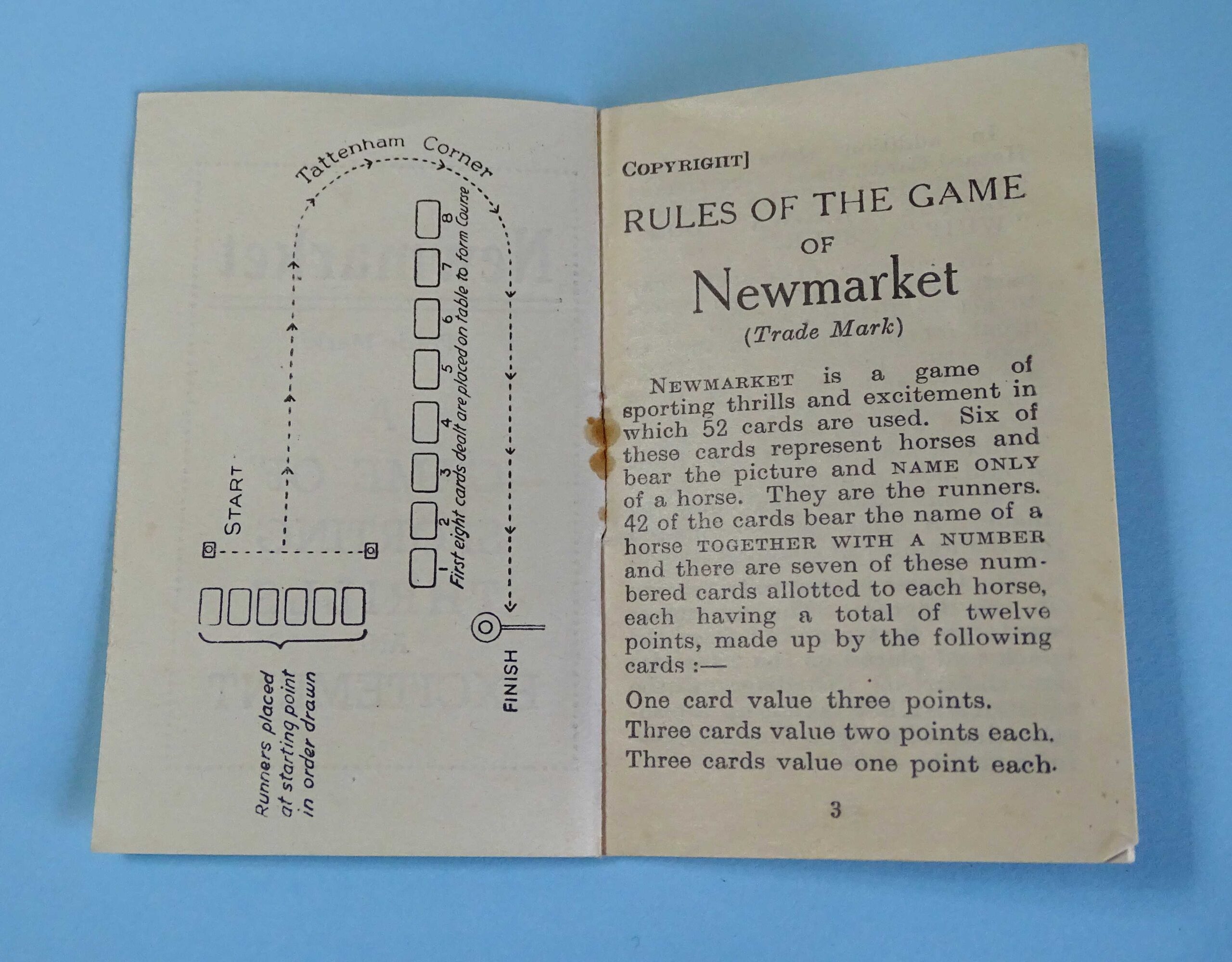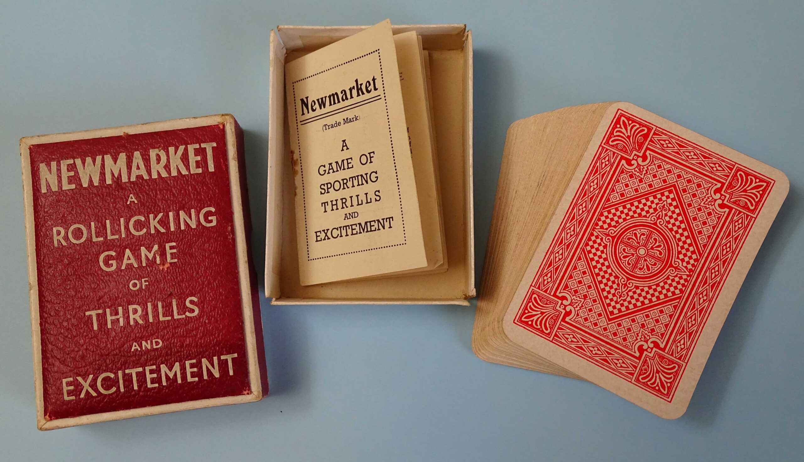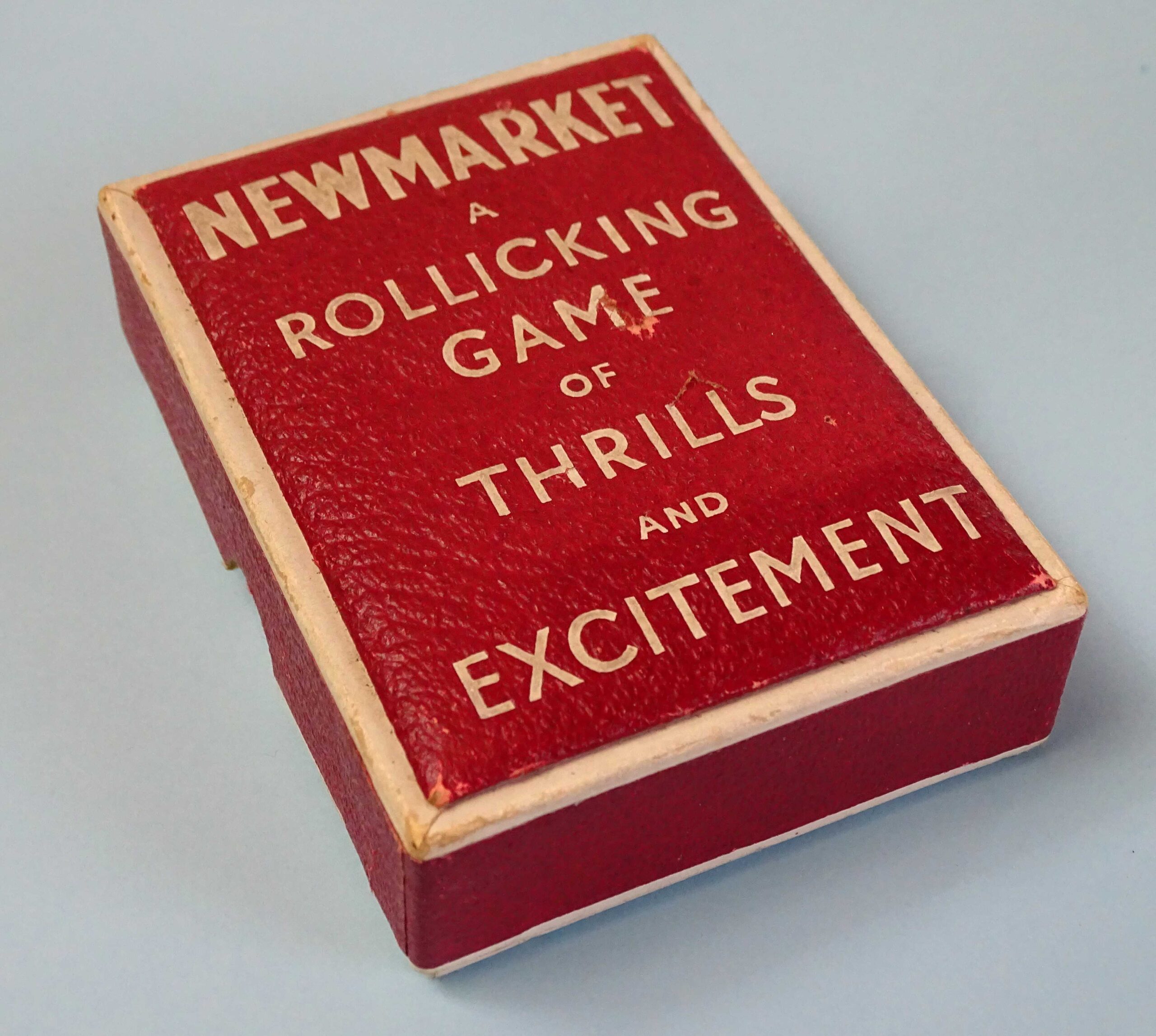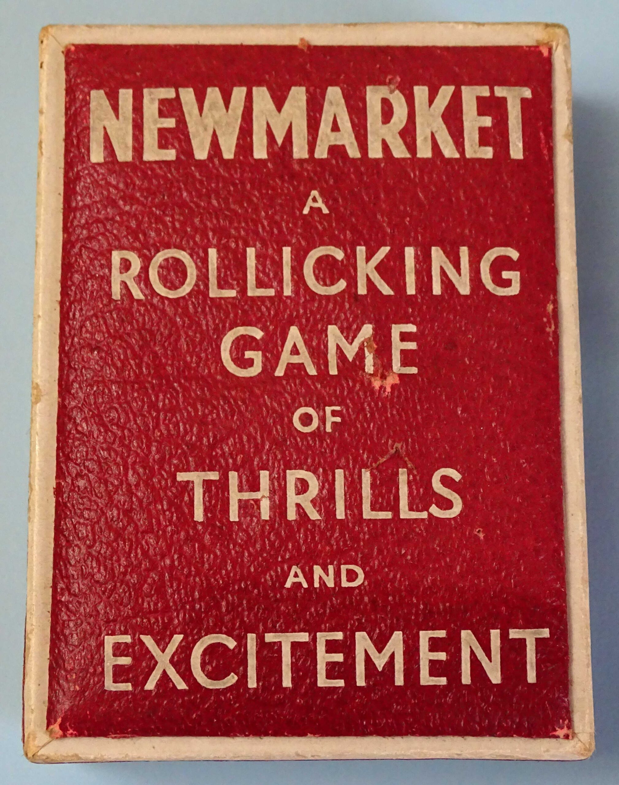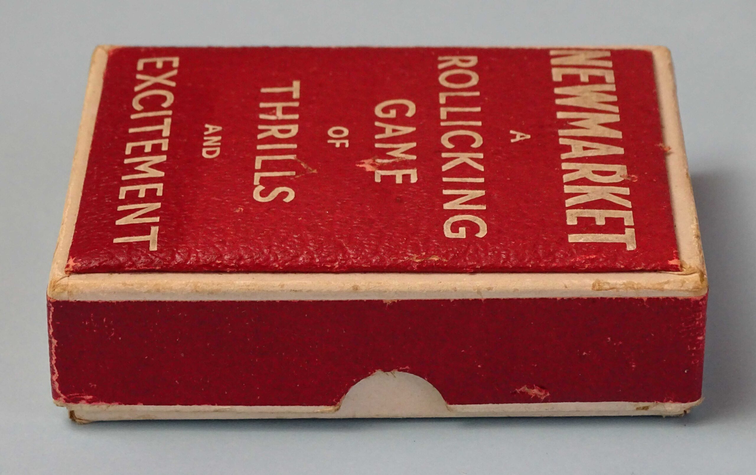 Very nice example of this vintage card game with a full set of cards in their original padded box. This is the red variant of the game. The cards are in excellent condition as shown. Also includes the original Rules booklet. The Newmarket game features six named thoroughbred race horses, all champions in their day: Persimmon;Jeddah; Flying Fox; Ormonde; Ladas and Bend Or. As can be seen in these links, these horses were racing around the turn of the last century. It may be that the game is even older than the 1930 attributed online?