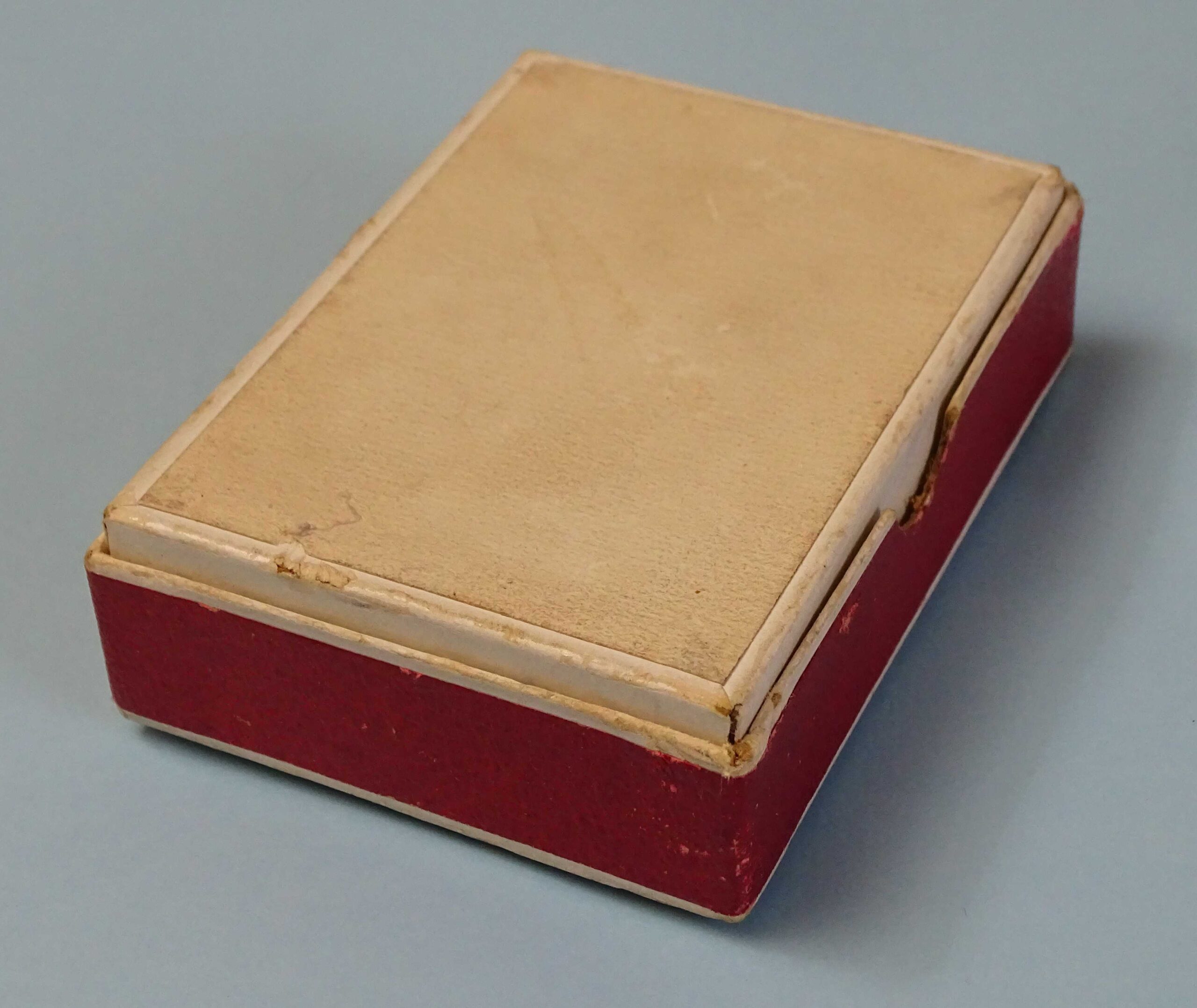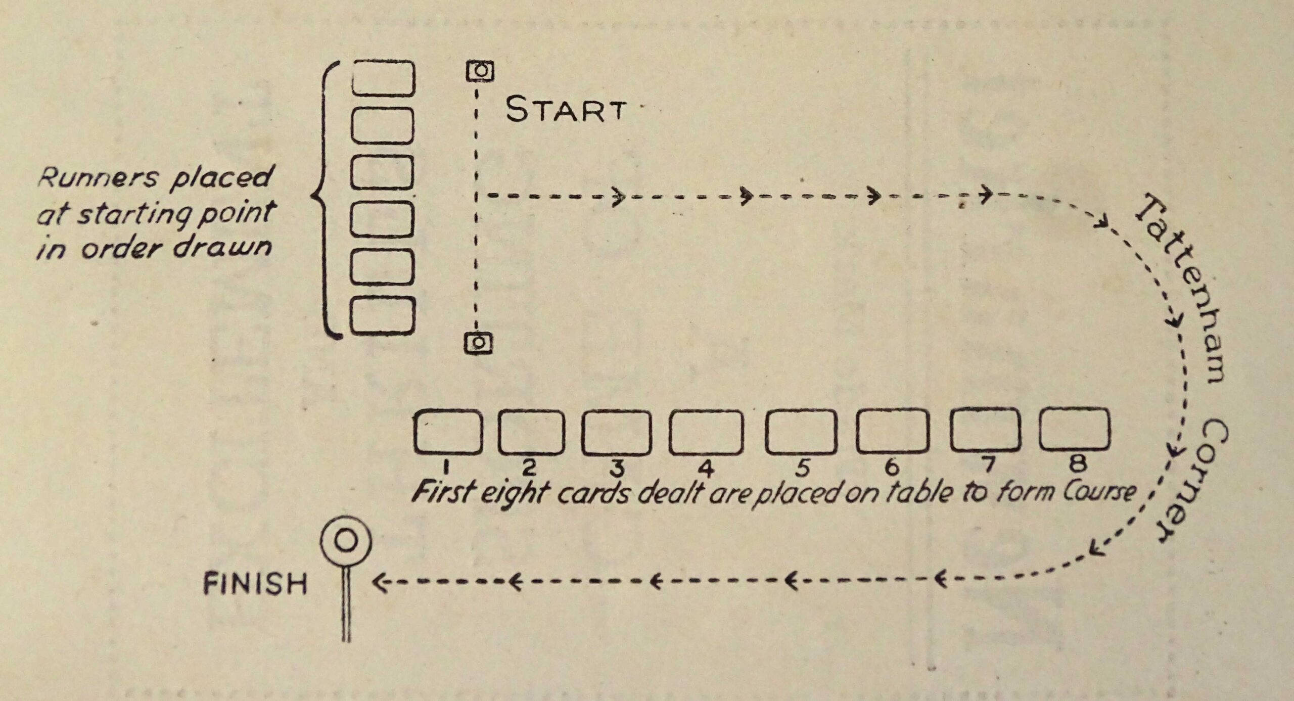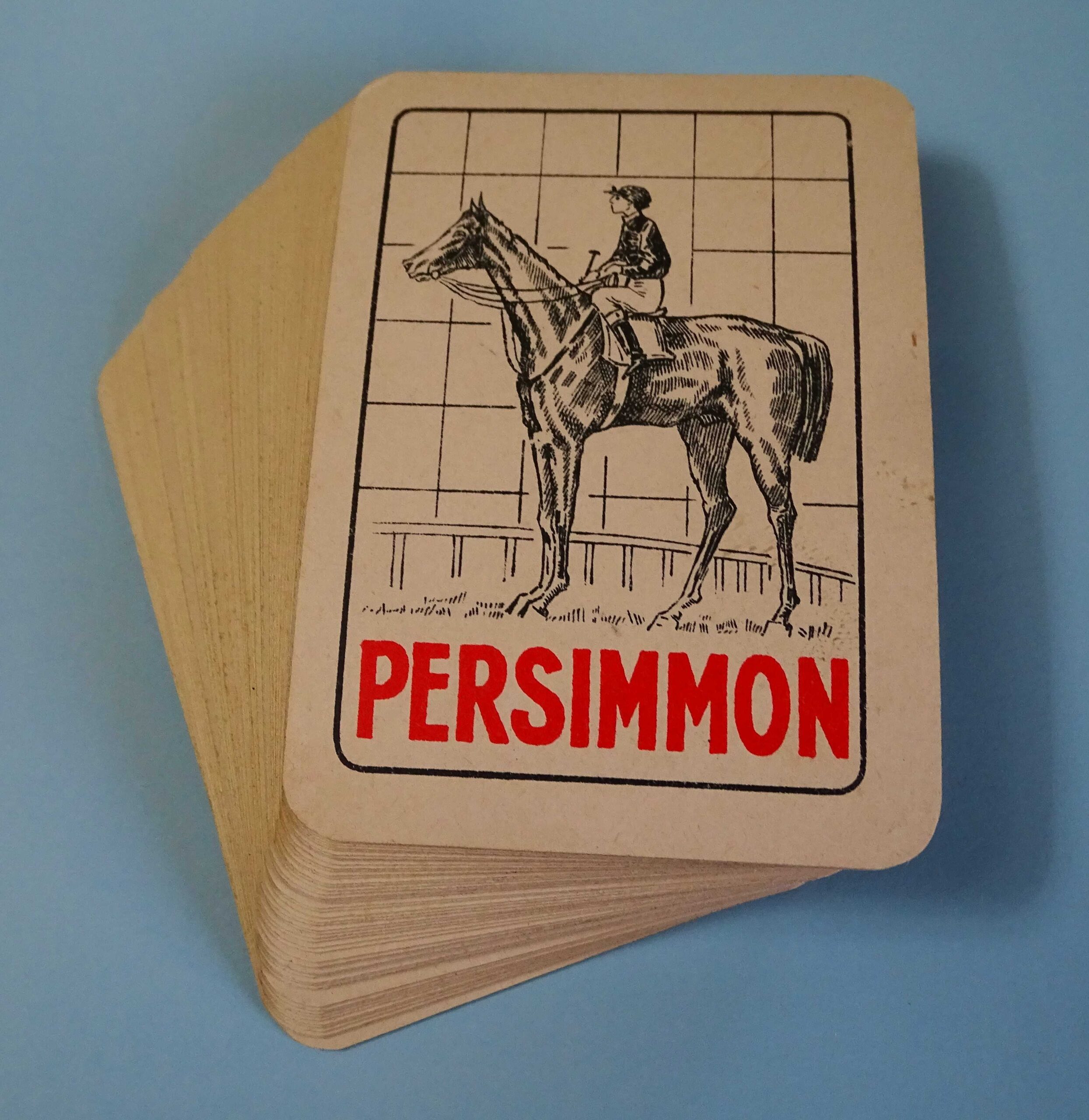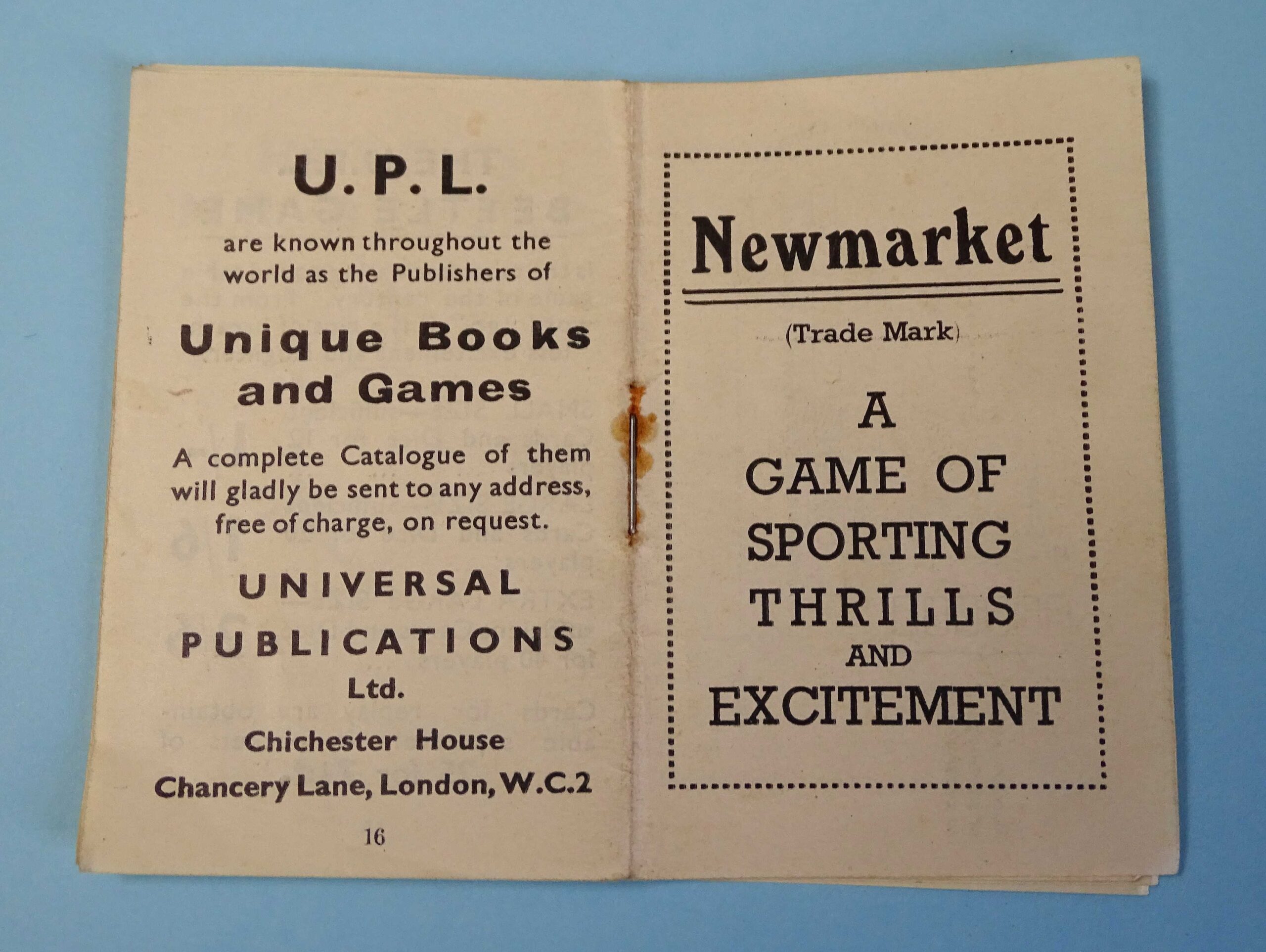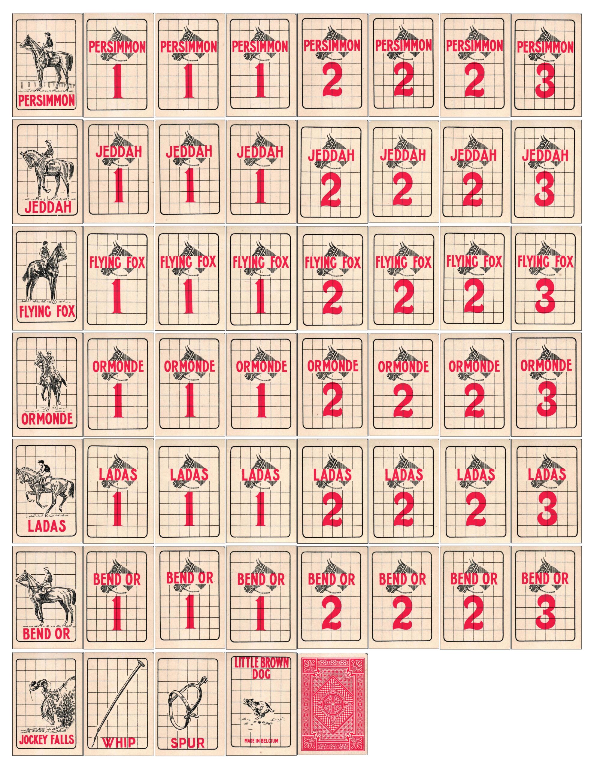 Very nice example of this vintage card game with a full set of cards in their original padded box. This is the red variant of the game. The cards are in excellent condition as shown. Also includes the original Rules booklet. The Newmarket game features six named thoroughbred race horses, all champions in their day: Persimmon;Jeddah; Flying Fox; Ormonde; Ladas and Bend Or. As can be seen in these links, these horses were racing around the turn of the last century. It may be that the game is even older than the 1930 attributed online?