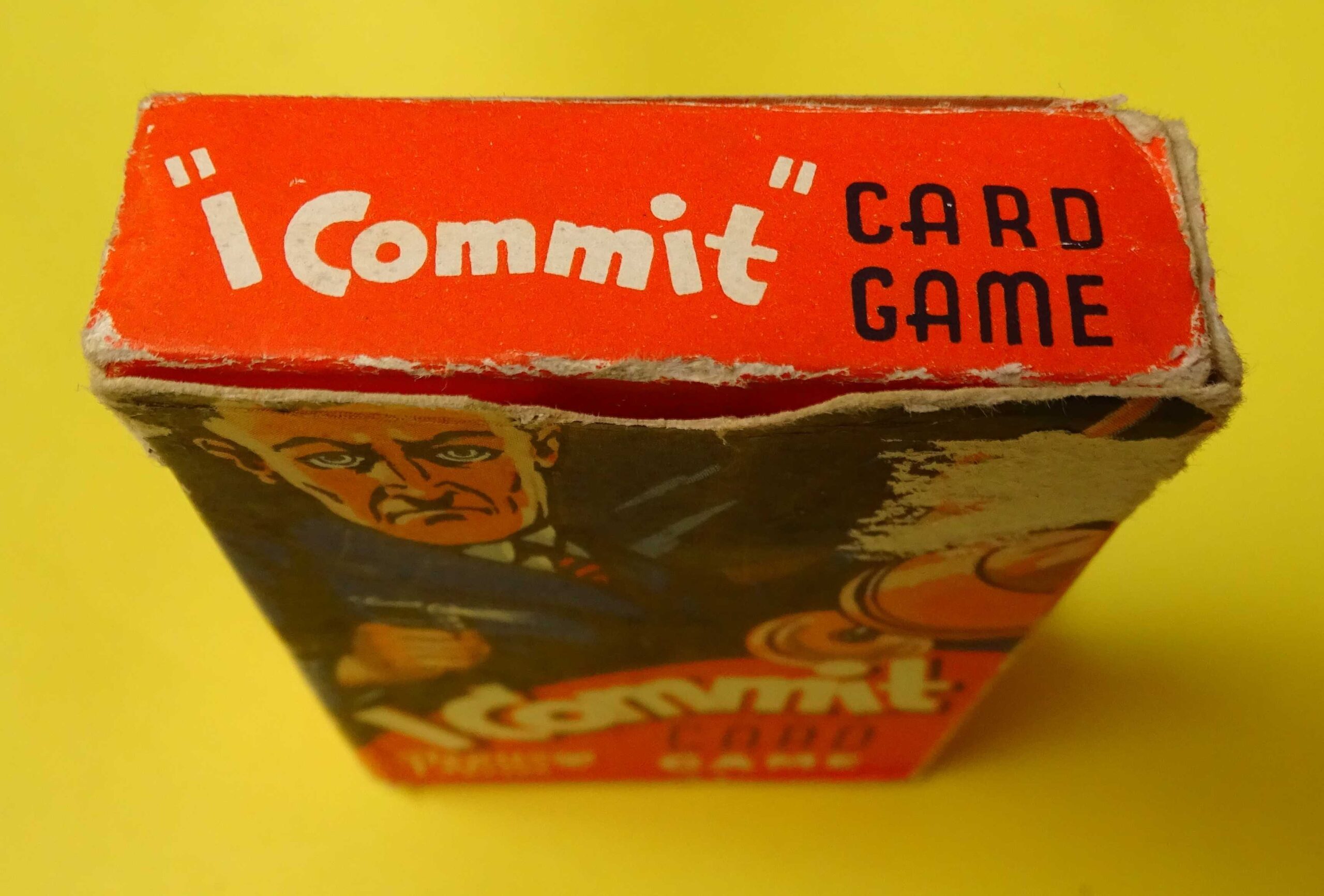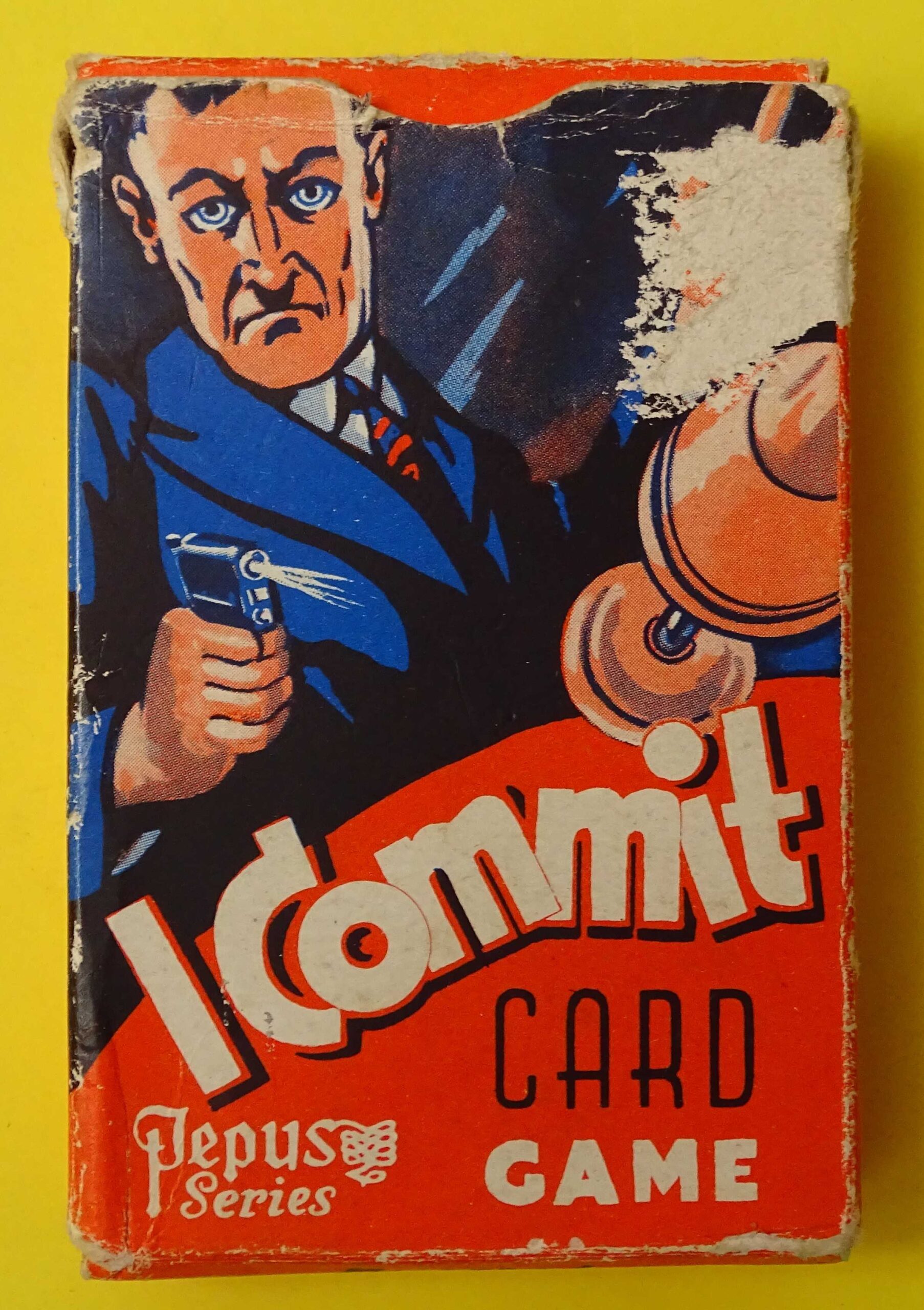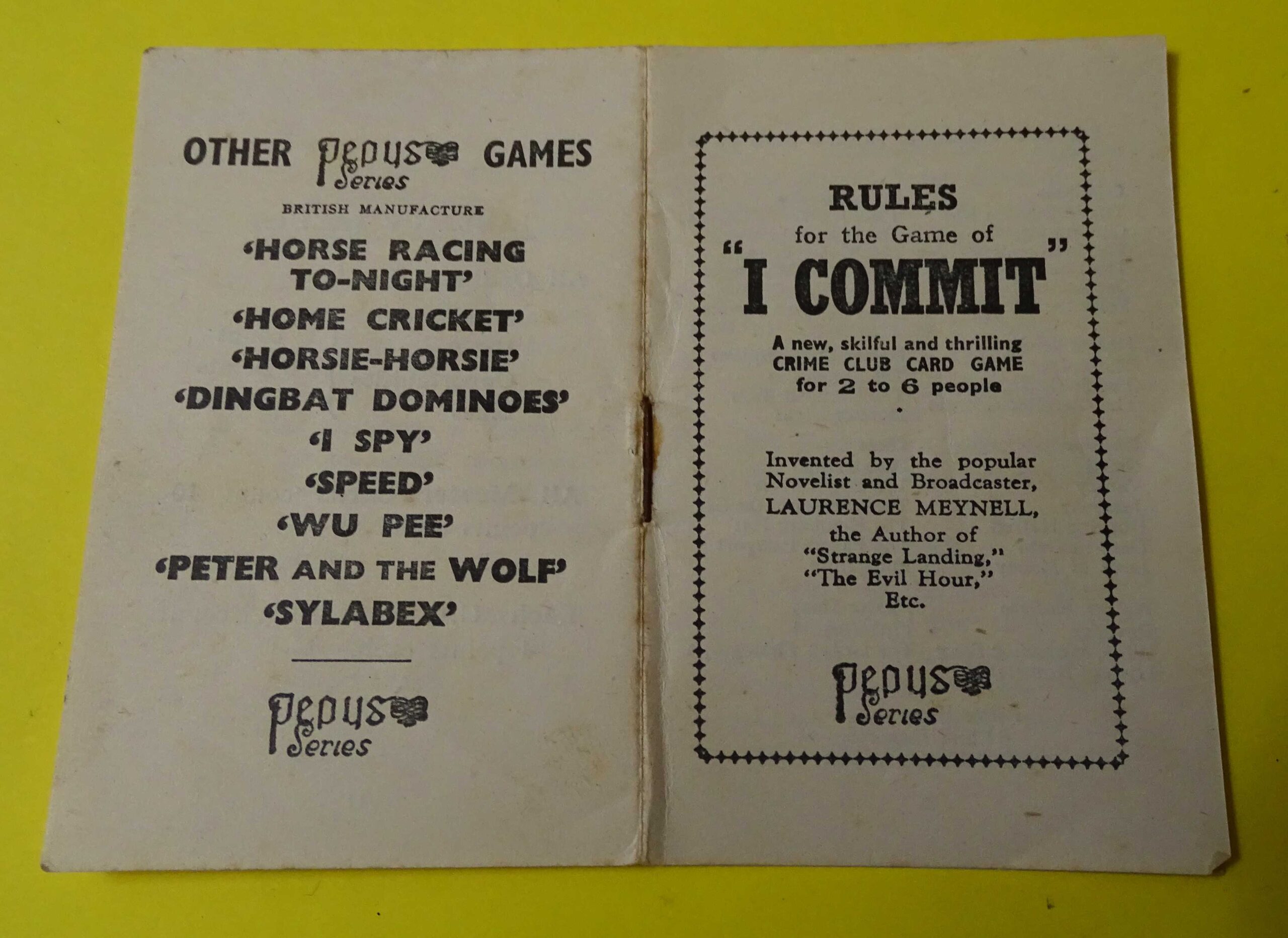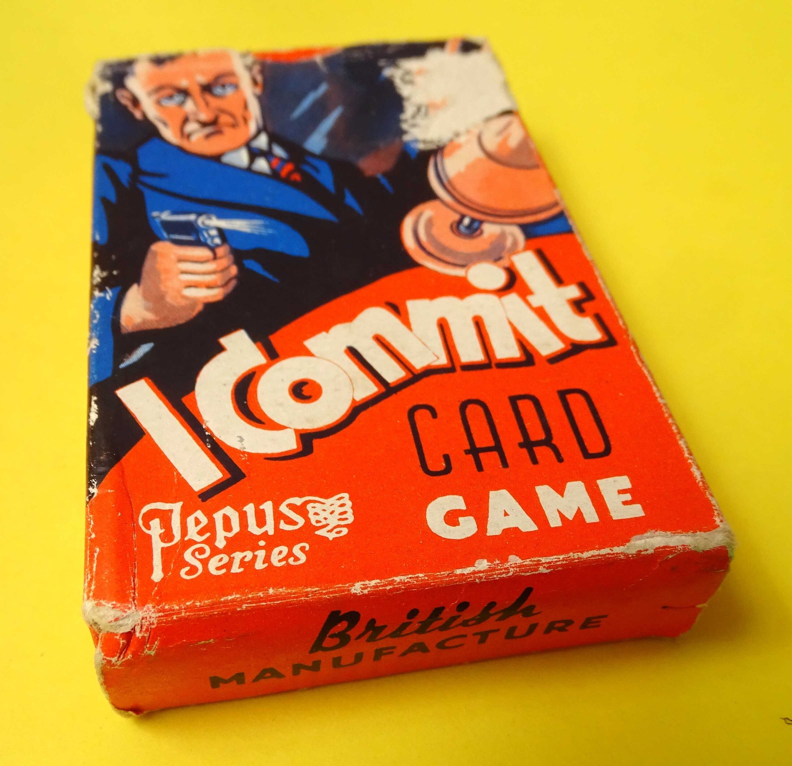 This wonderful vintage card game “I Commit” was invented by novelist Laurence Meynell. With superb illustrations, typical of the Pepys brand, the cards depict numerous criminal characters, along with their motives, opportunities and clues. The game is complete with a full deck of 53 cards and the original Rules booklet as shown. The cards are in great condition with little sign of use. The game was published in 1948 by Castell Brothers of London.