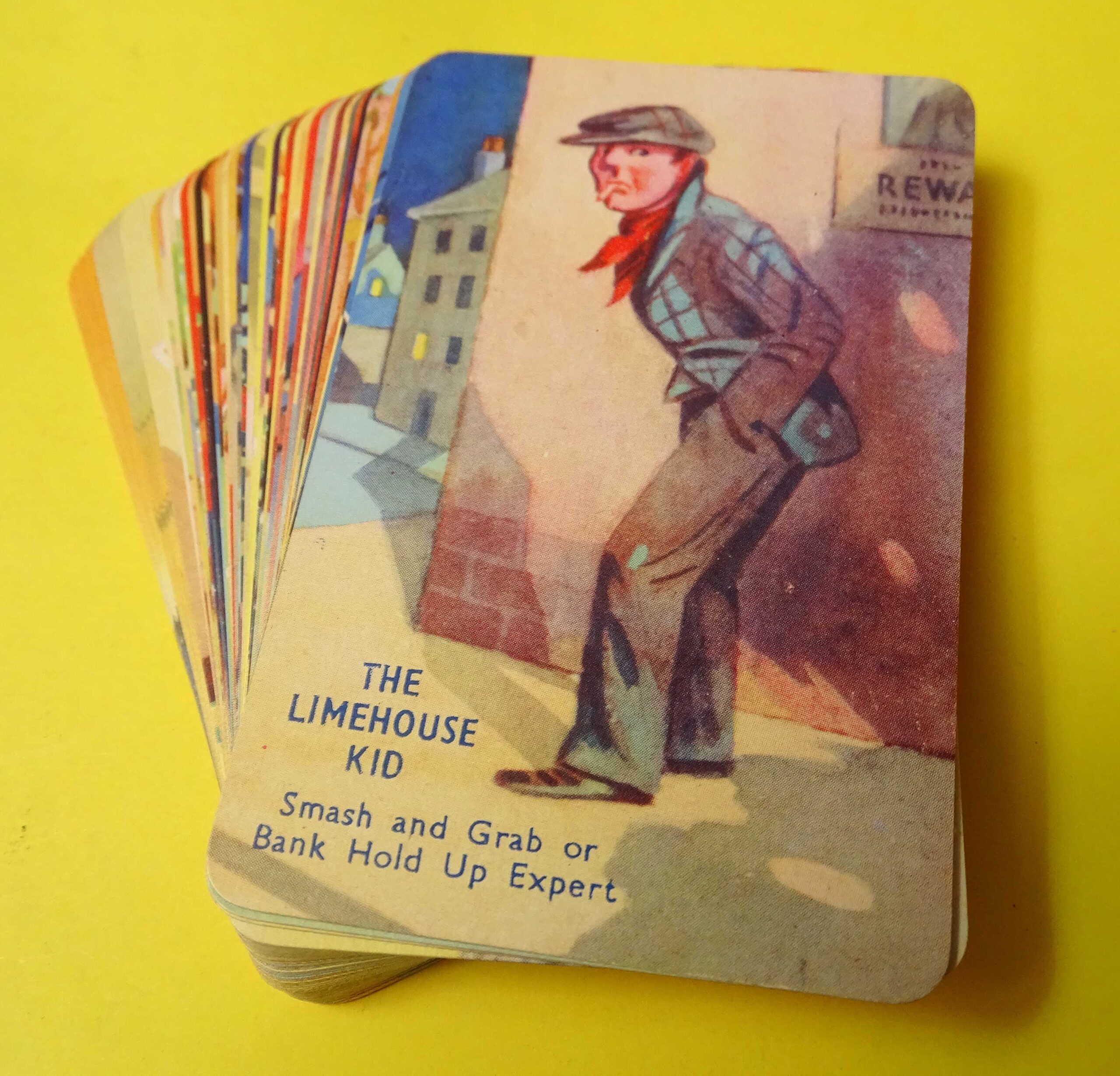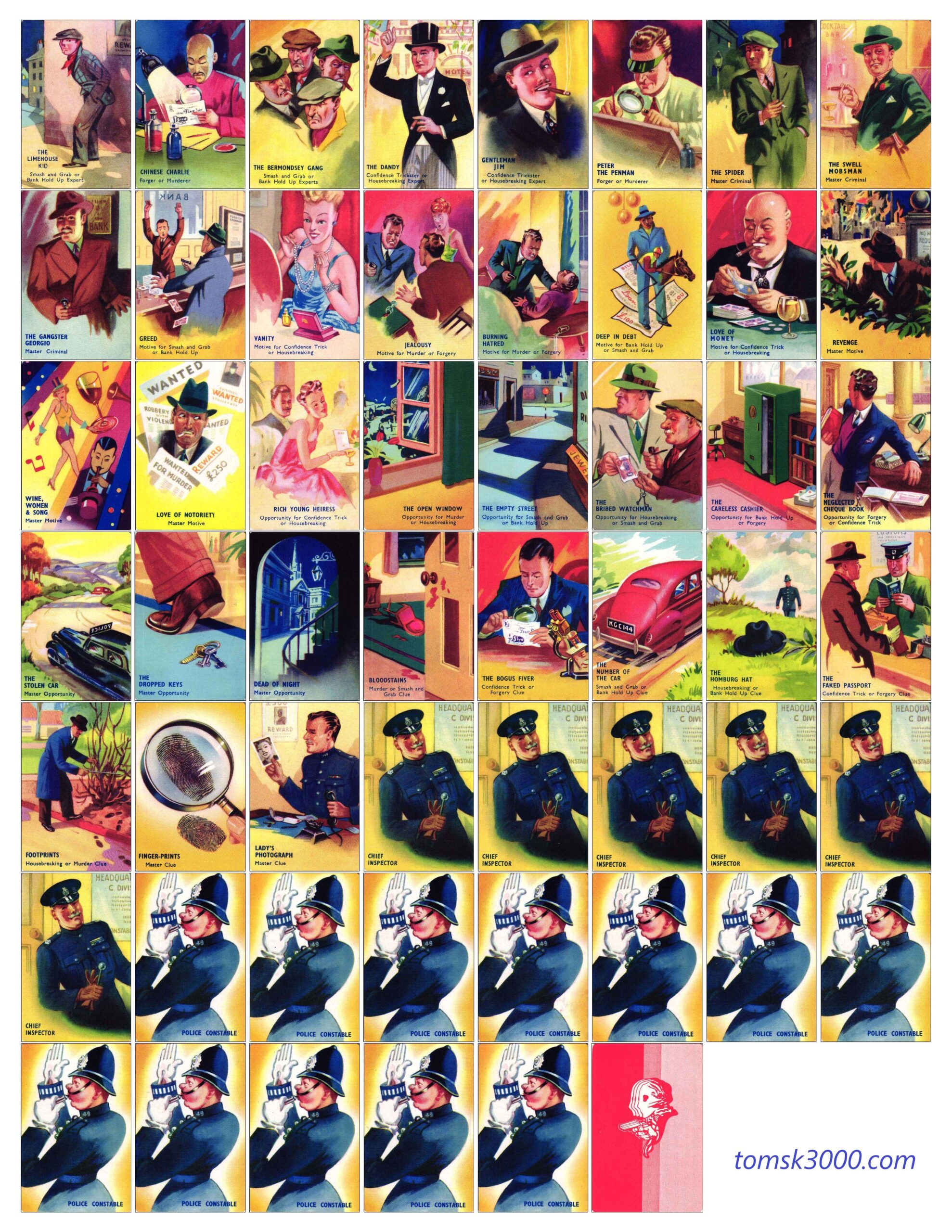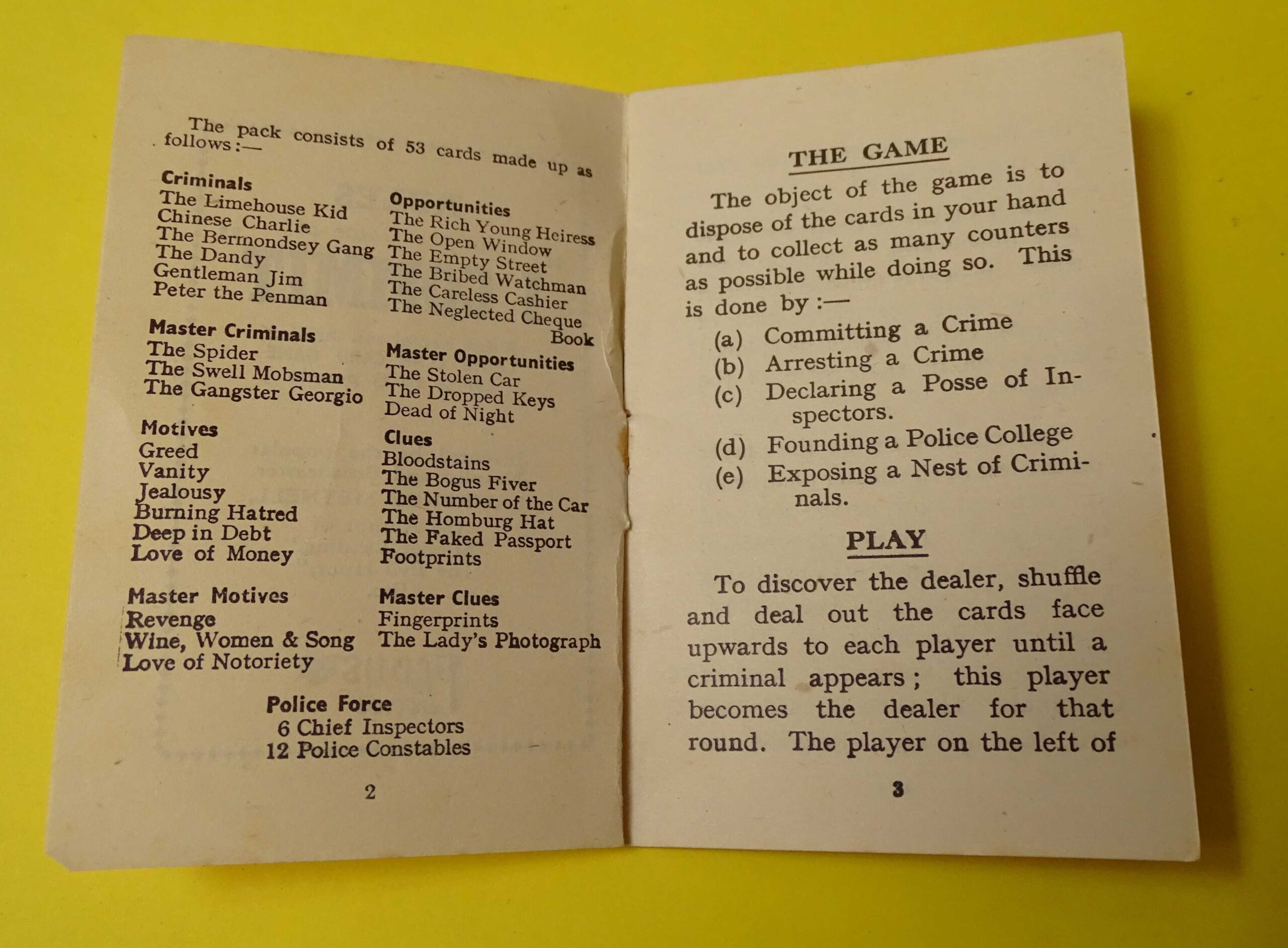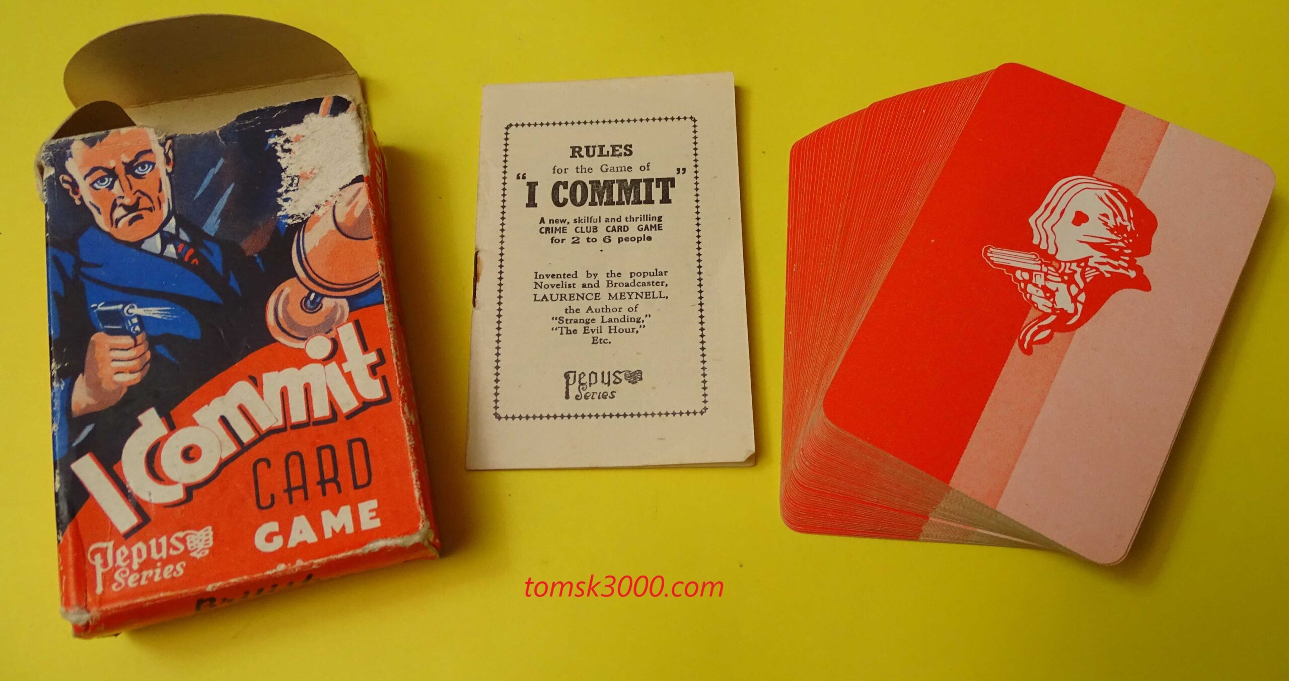 This wonderful vintage card game “I Commit” was invented by novelist Laurence Meynell. With superb illustrations, typical of the Pepys brand, the cards depict numerous criminal characters, along with their motives, opportunities and clues. The game is complete with a full deck of 53 cards and the original Rules booklet as shown. The cards are in great condition with little sign of use. The game was published in 1948 by Castell Brothers of London.