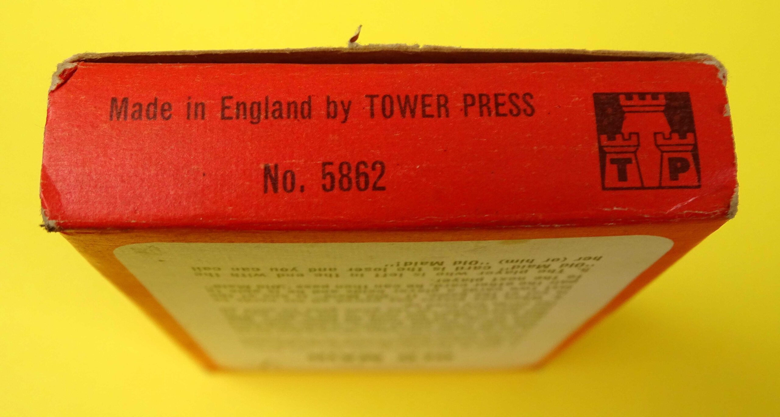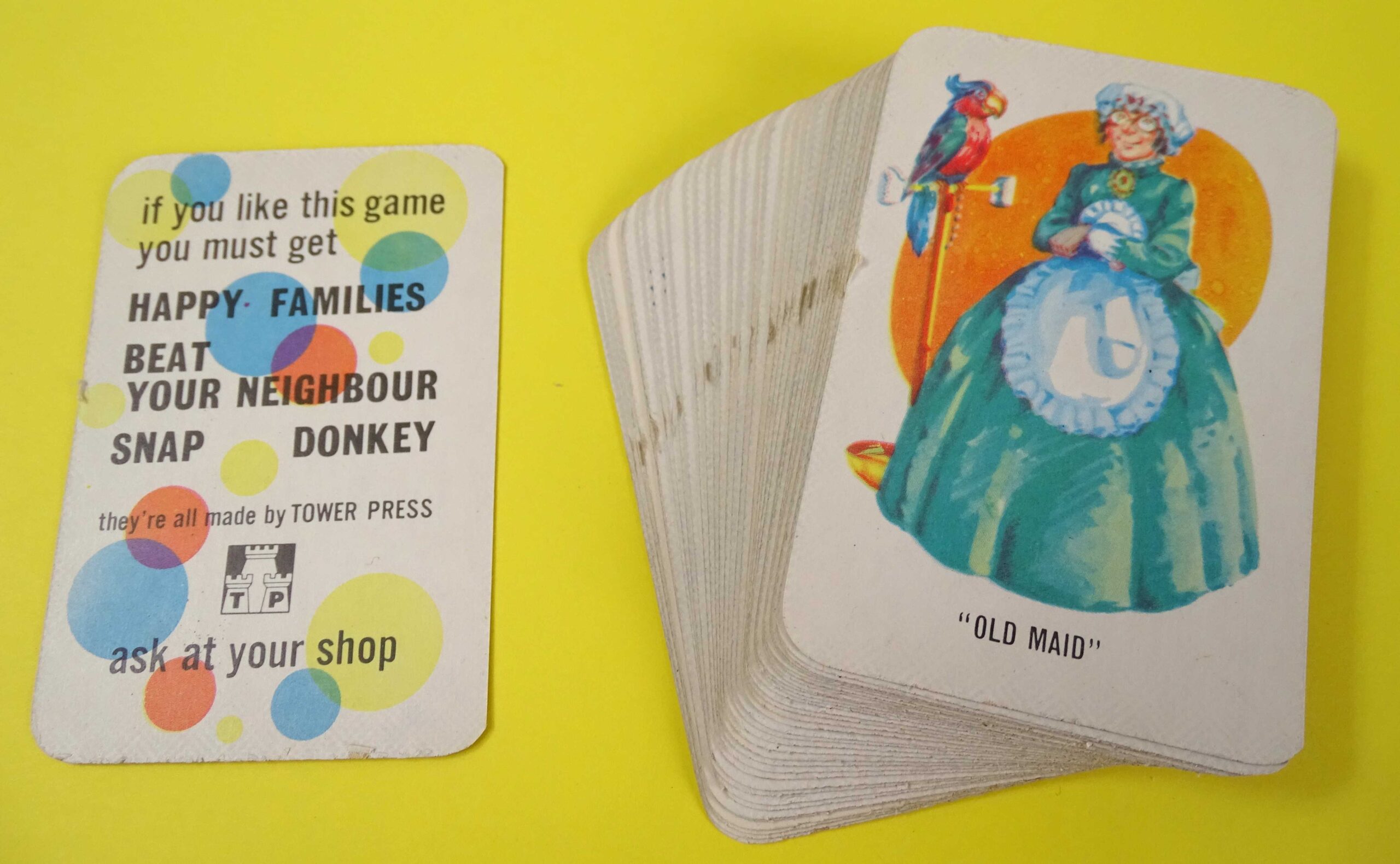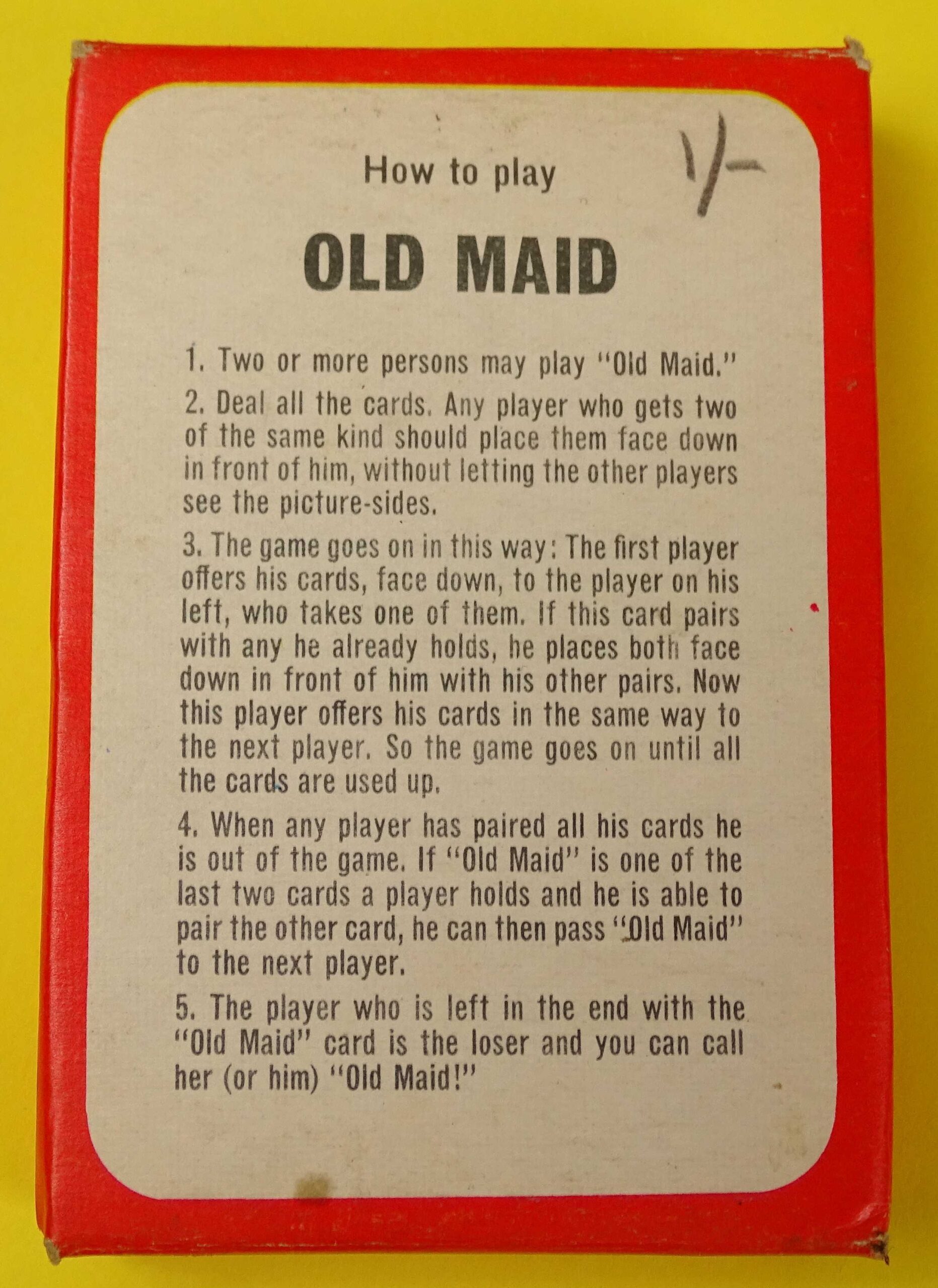 Here’s a lovely example of a classic card game. This Old Maid game is complete with little sign of use. Made in England by Tower Press and published in the post-War period c. 1950’s. The game rules are printed on the back of the box as shown. There is a full deck of original cards and it even includes the advertising card!