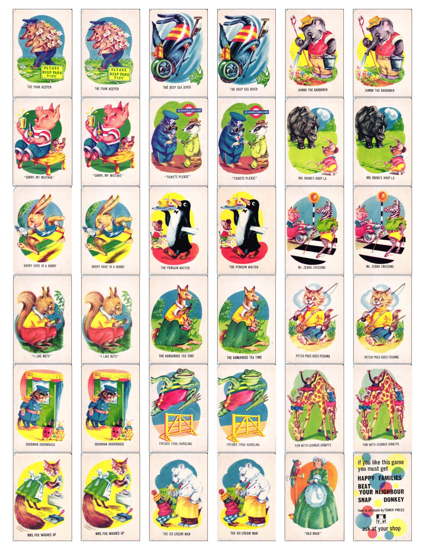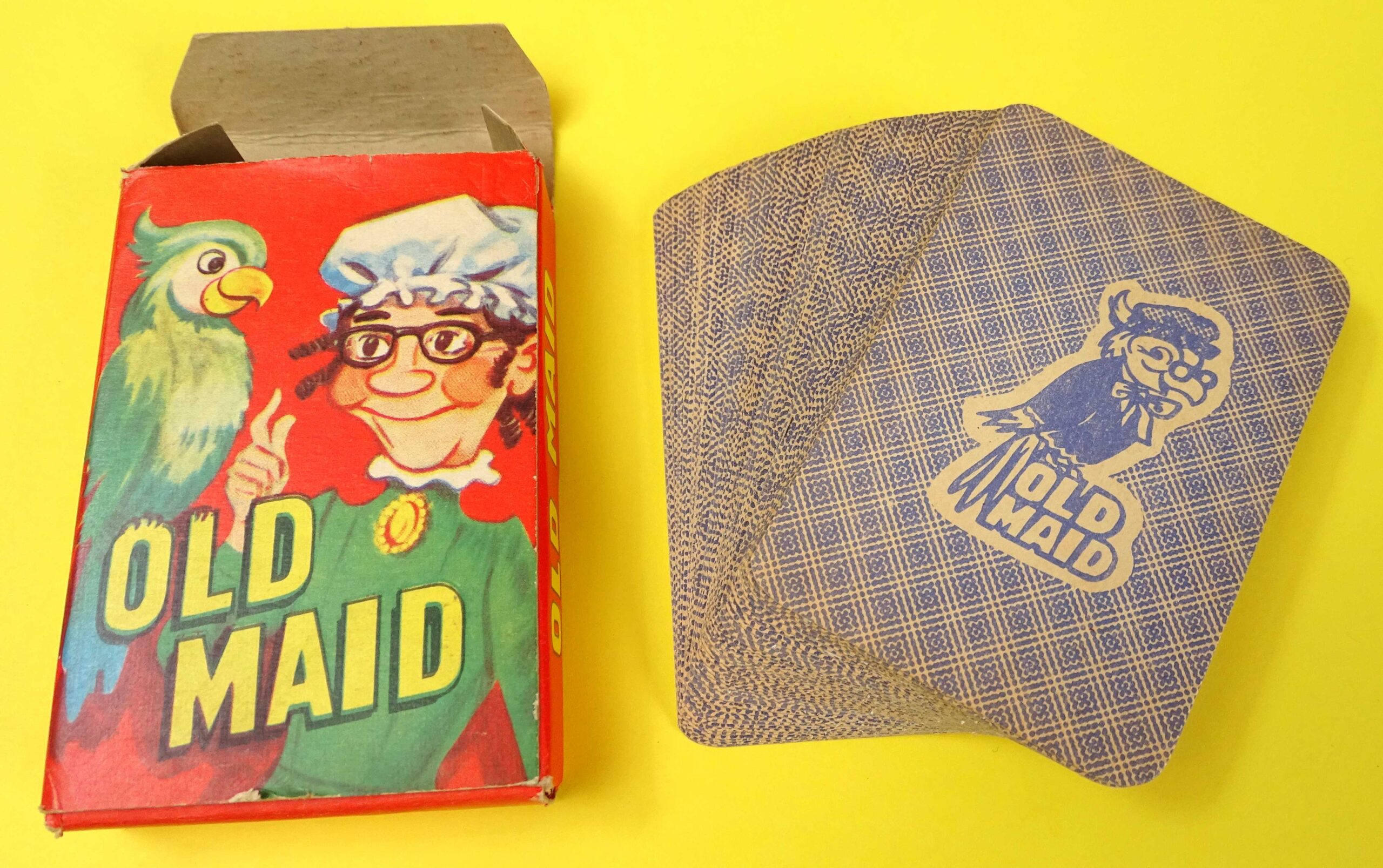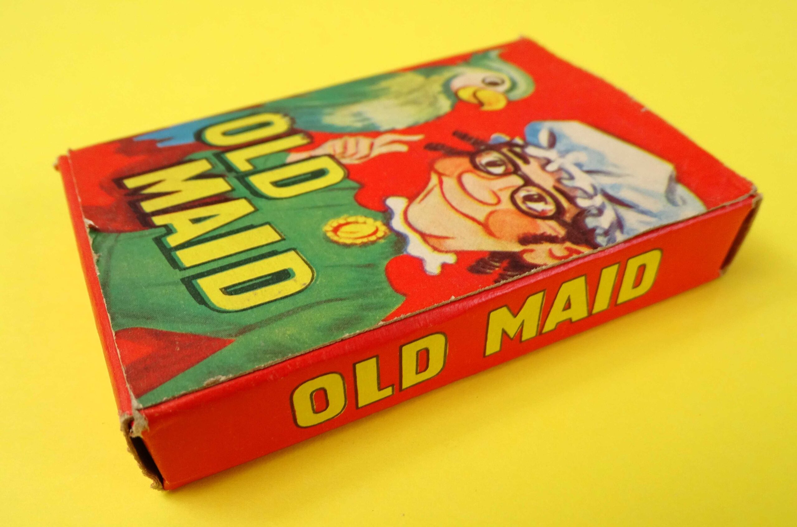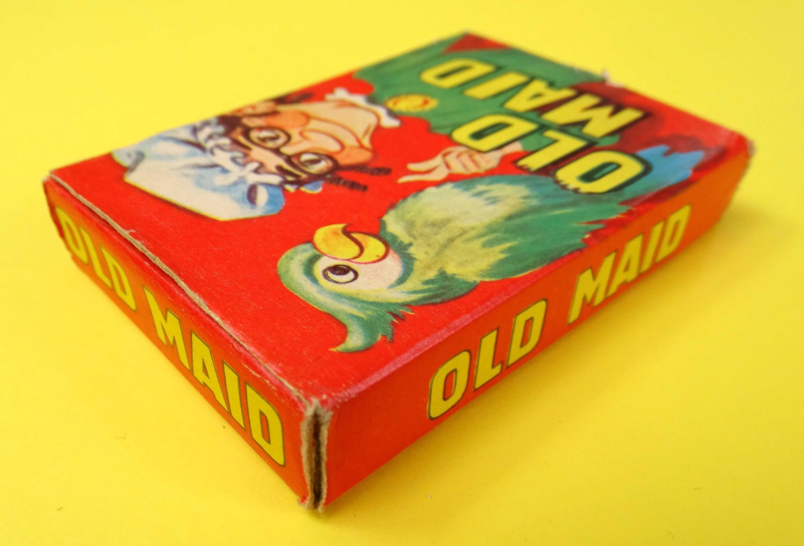 Here’s a lovely example of a classic card game. This Old Maid game is complete with little sign of use. Made in England by Tower Press and published in the post-War period c. 1950’s. The game rules are printed on the back of the box as shown. There is a full deck of original cards and it even includes the advertising card!