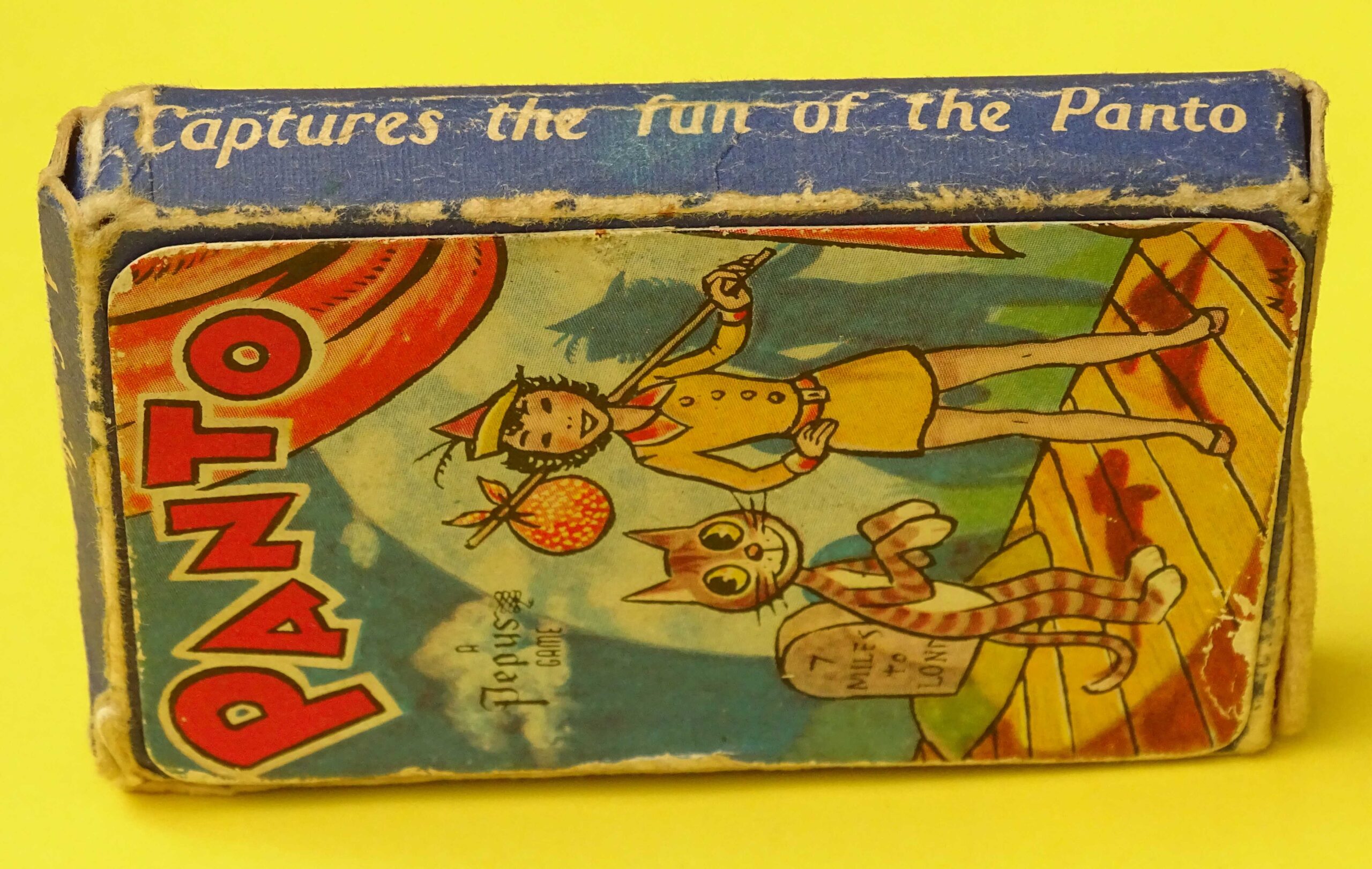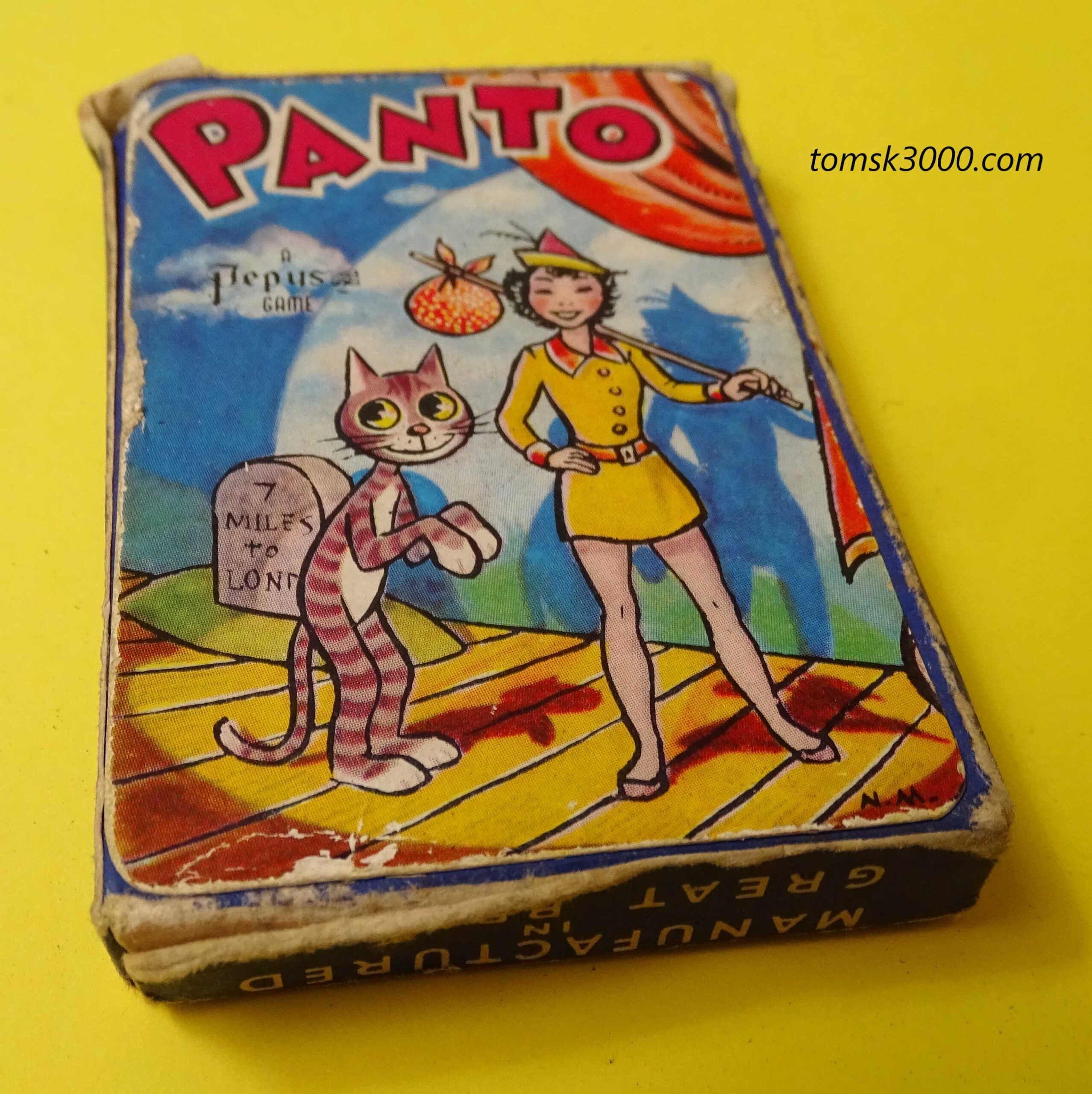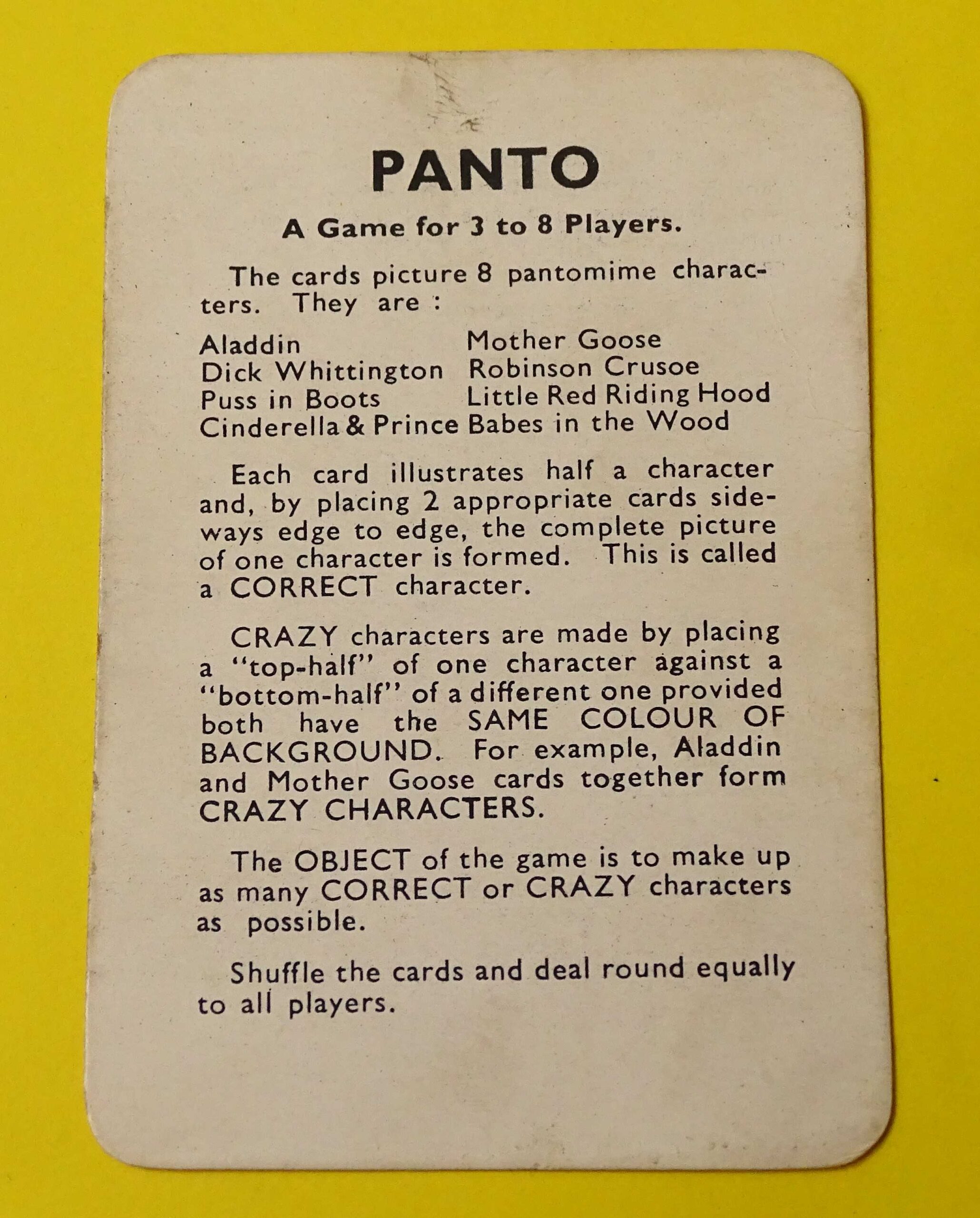 Published by Pepys Games in 1956, this is one of their rarer offerings. Here we have a nice, complete example of Panto with a full compliment of 32 cards depicting characters from traditional British Pantomimes. The wonderful illustrations are by Neville Main. The game includes the original Rules Card as shown.