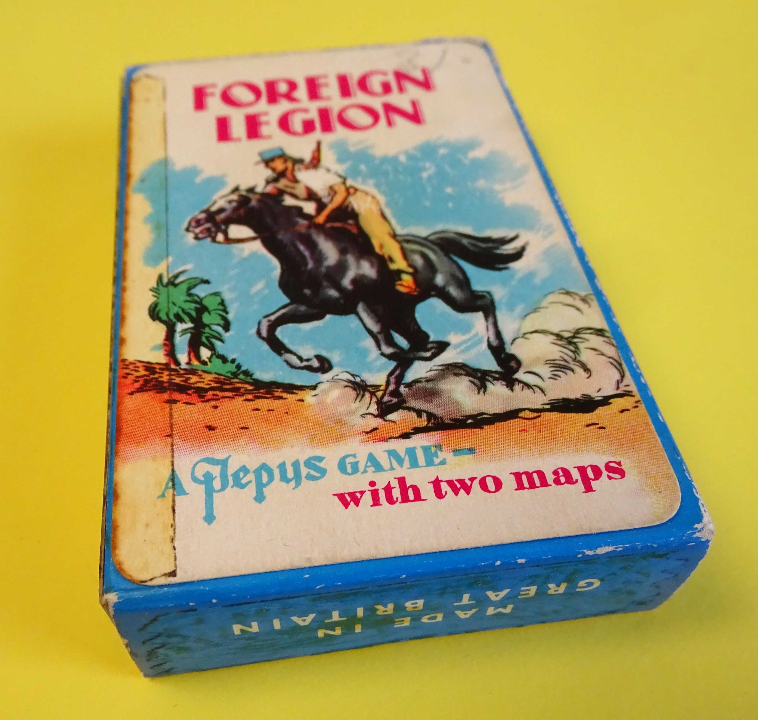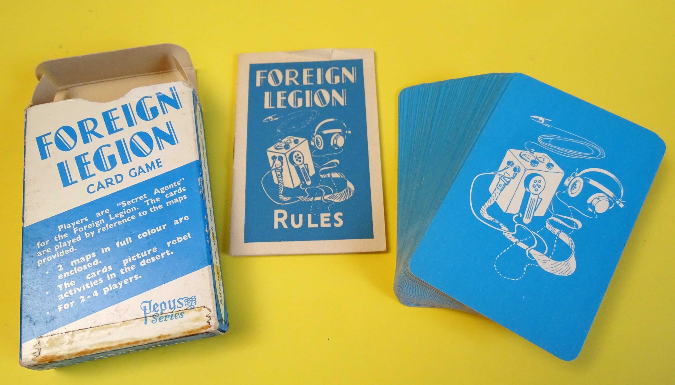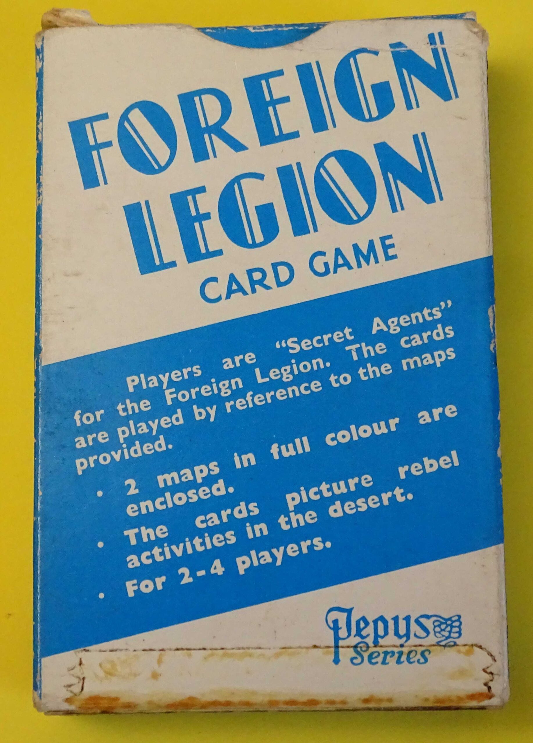 Here we have a wonderful vintage card game with a full deck of 44 cards in excellent condition. In Foreign Legion, players act as Secret Agent Legionnaires, attempting to locate and observe rebel organisations. Eight of the cards form two maps of the area. The original Rules booklet is included and the box is in good structural condition as shown. Dating from 1960, the game was published by Castell Brothers of London under their famous Pepys brand name.