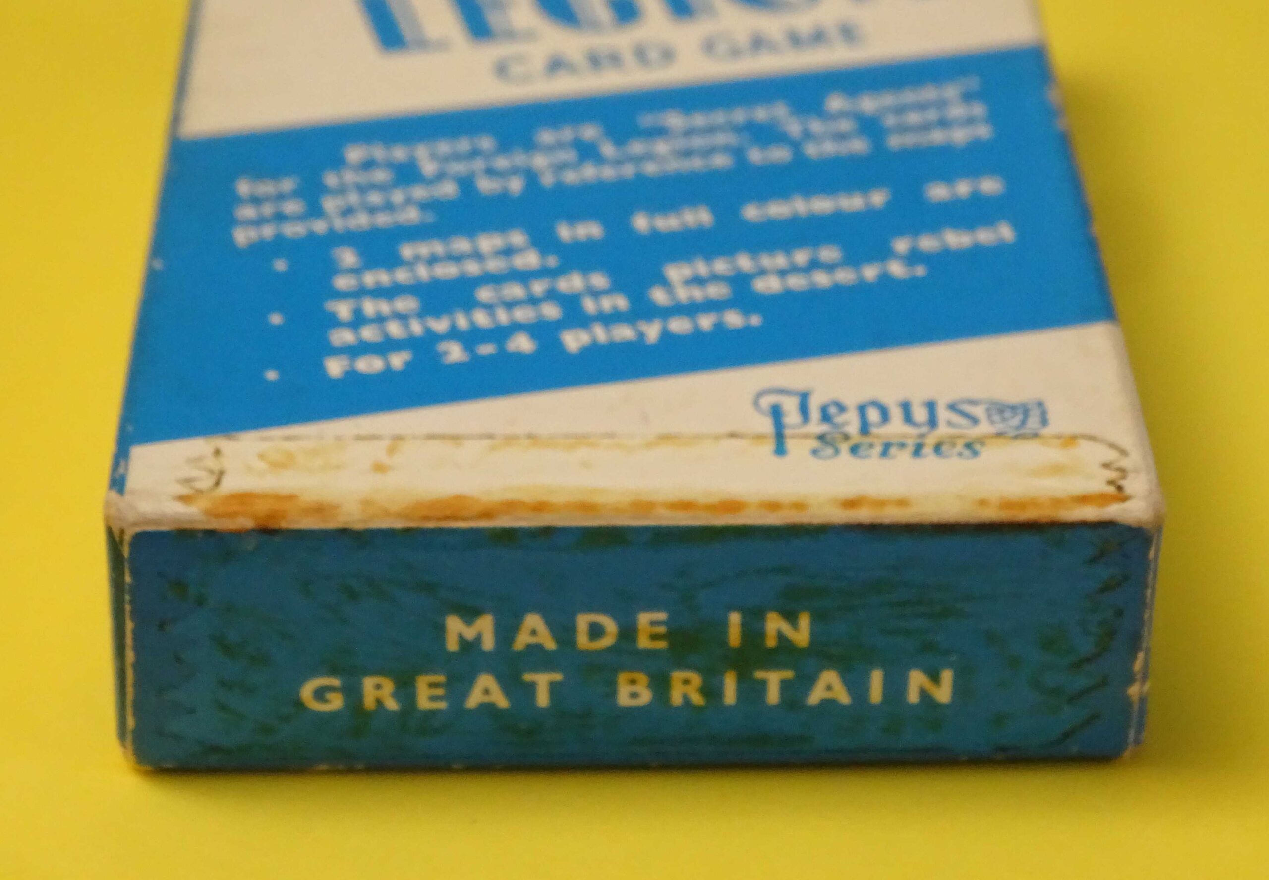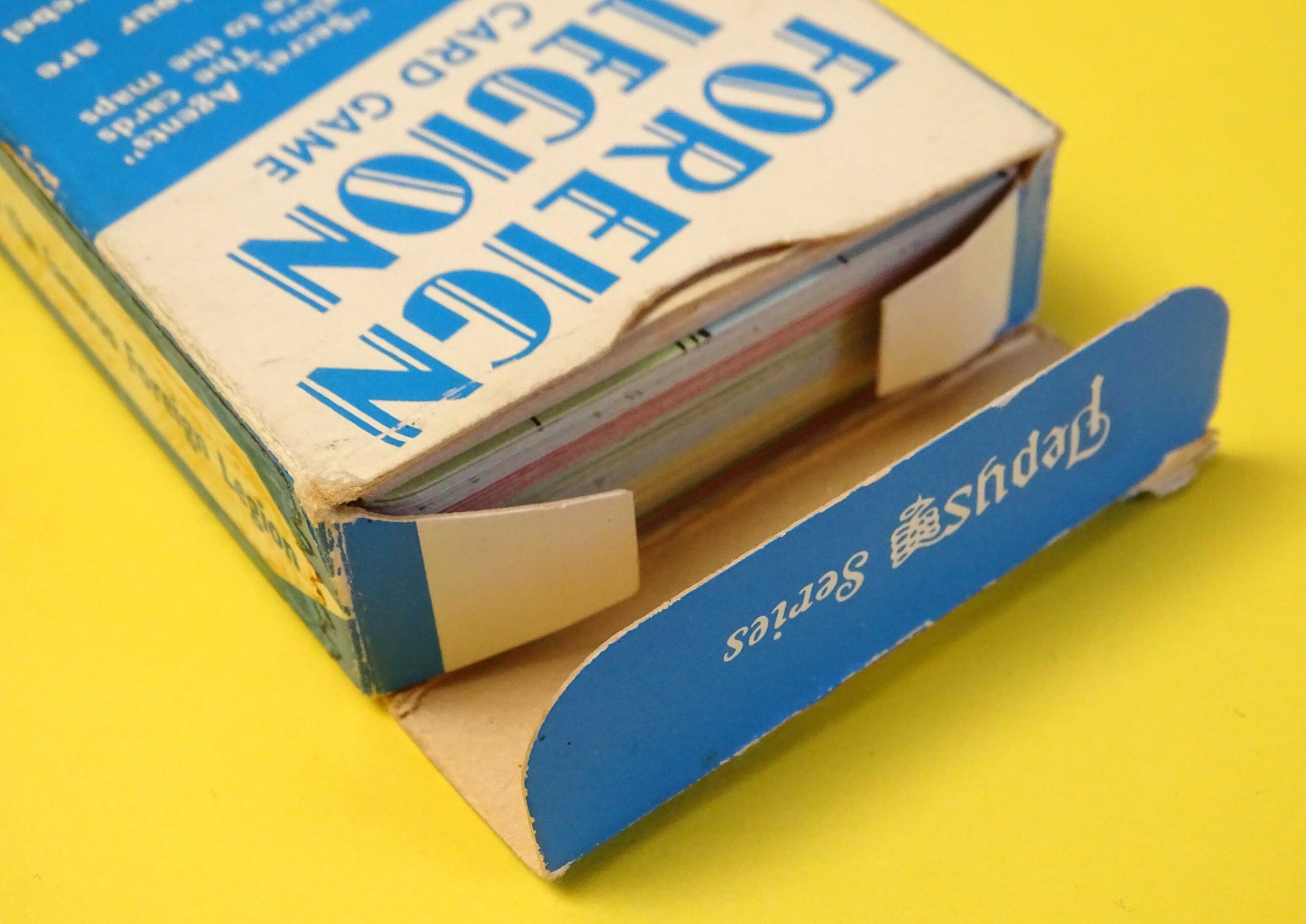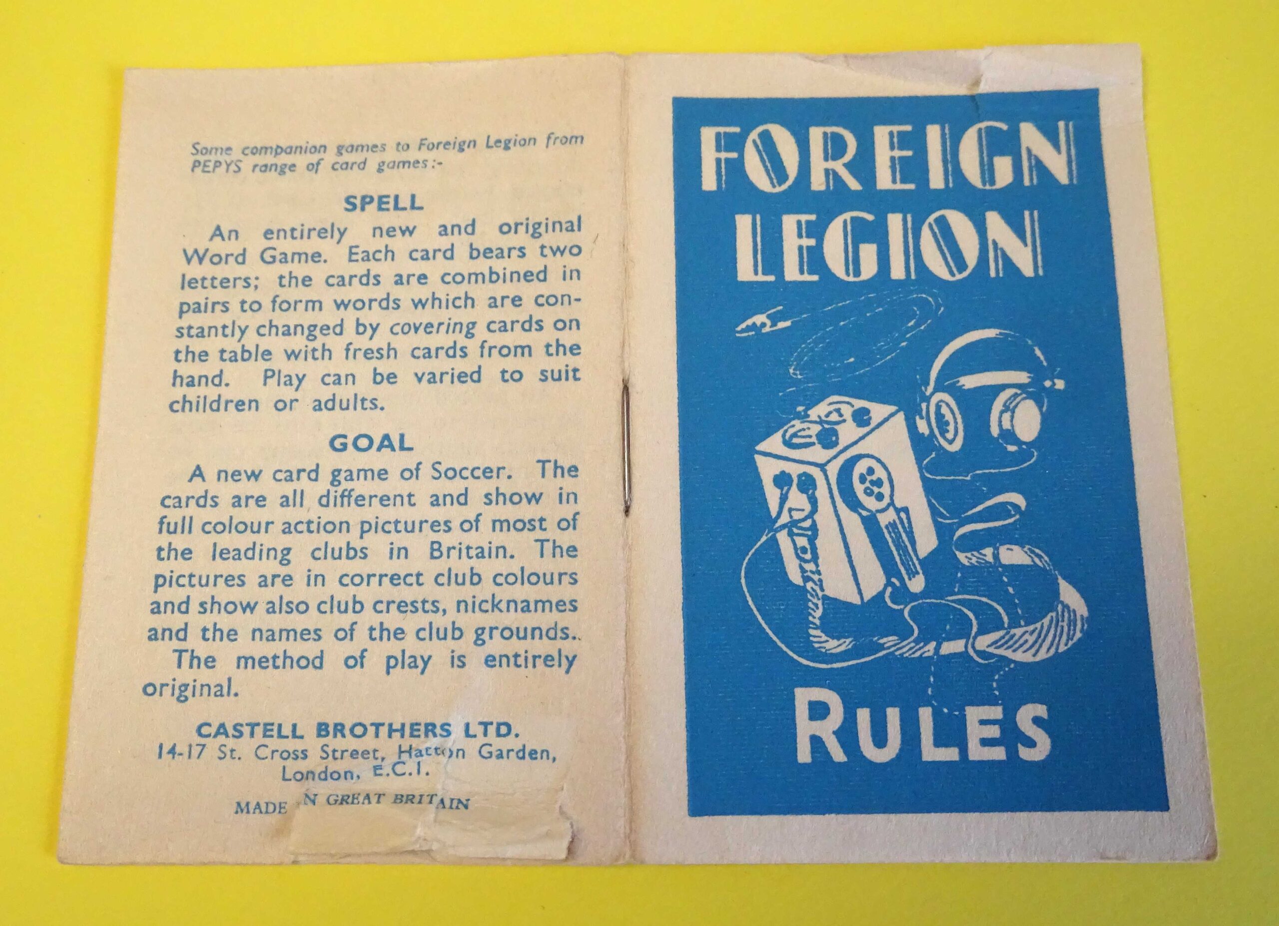 Here we have a wonderful vintage card game with a full deck of 44 cards in excellent condition. In Foreign Legion, players act as Secret Agent Legionnaires, attempting to locate and observe rebel organisations. Eight of the cards form two maps of the area. The original Rules booklet is included and the box is in good structural condition as shown. Dating from 1960, the game was published by Castell Brothers of London under their famous Pepys brand name.