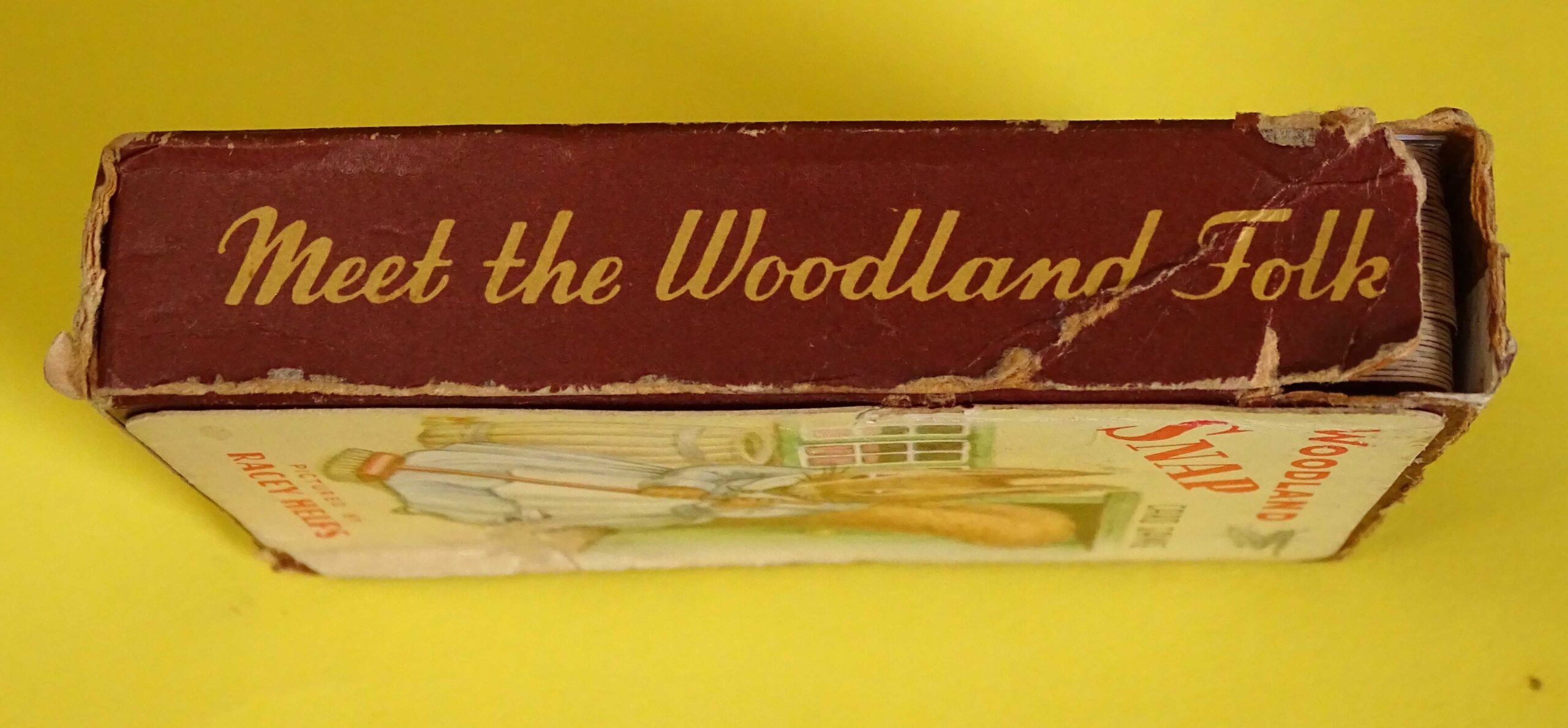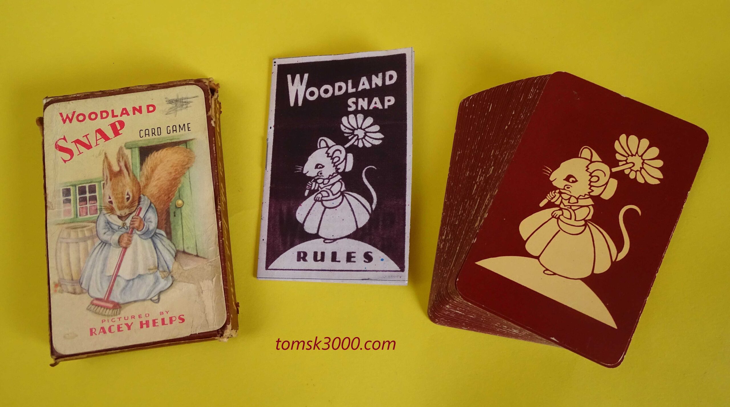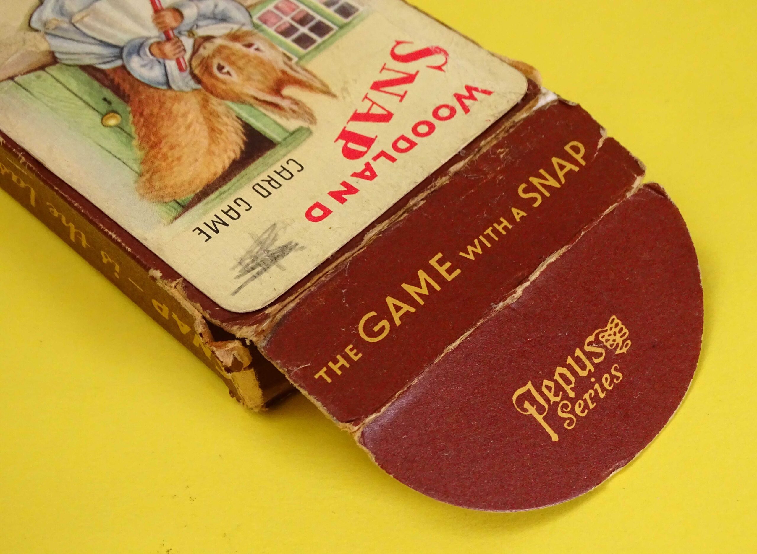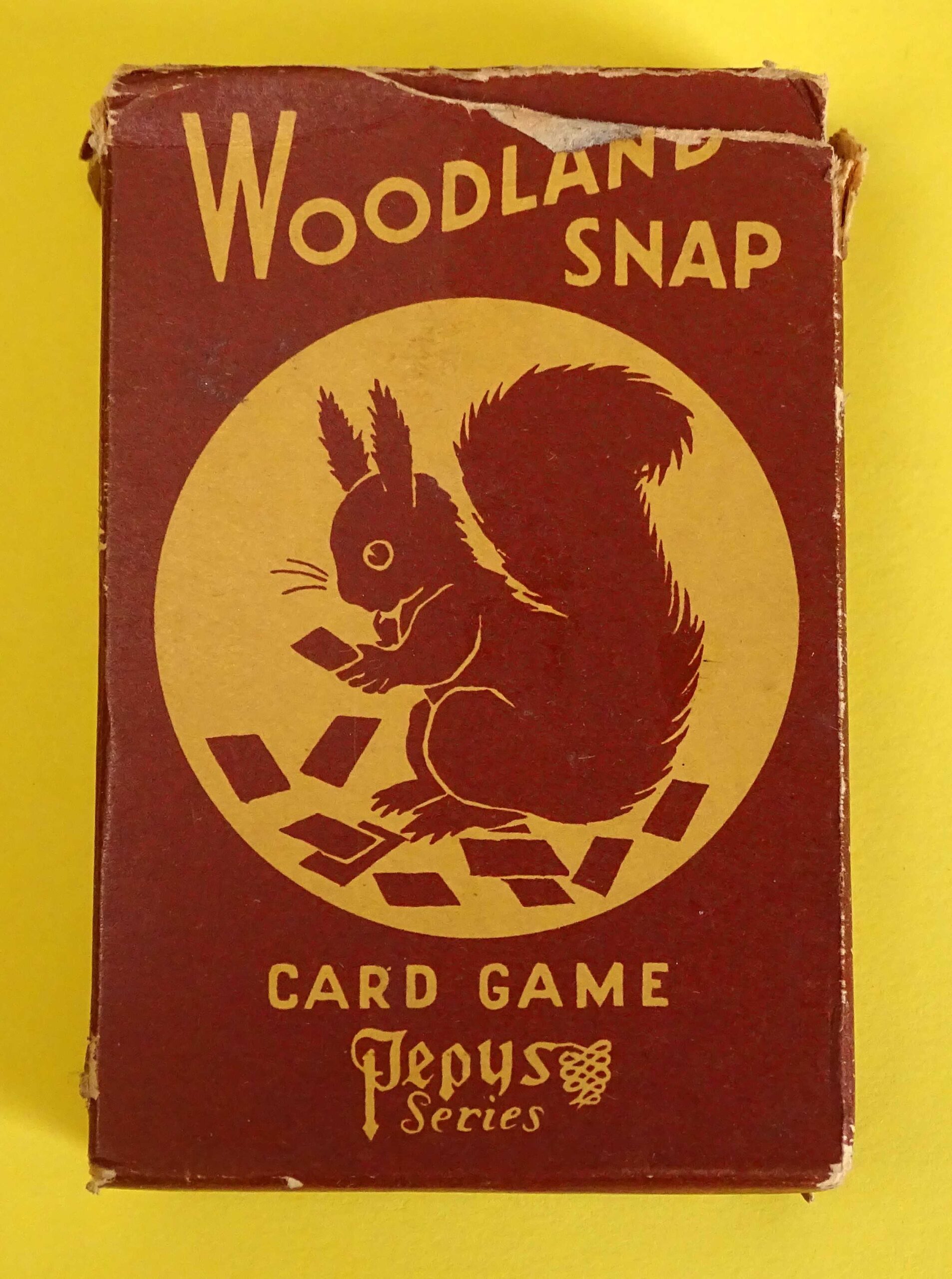 A delightful vintage card game with a full deck of cards, beautifully illustrated by Racey Helps. The box has taken a few knocks and repairs over the years but the cards are in excellent condition as shown. I have also included a copy of the Rules for completeness. Woodland Snap is a Pepys game, published by Castell Brothers of London in around 1960,