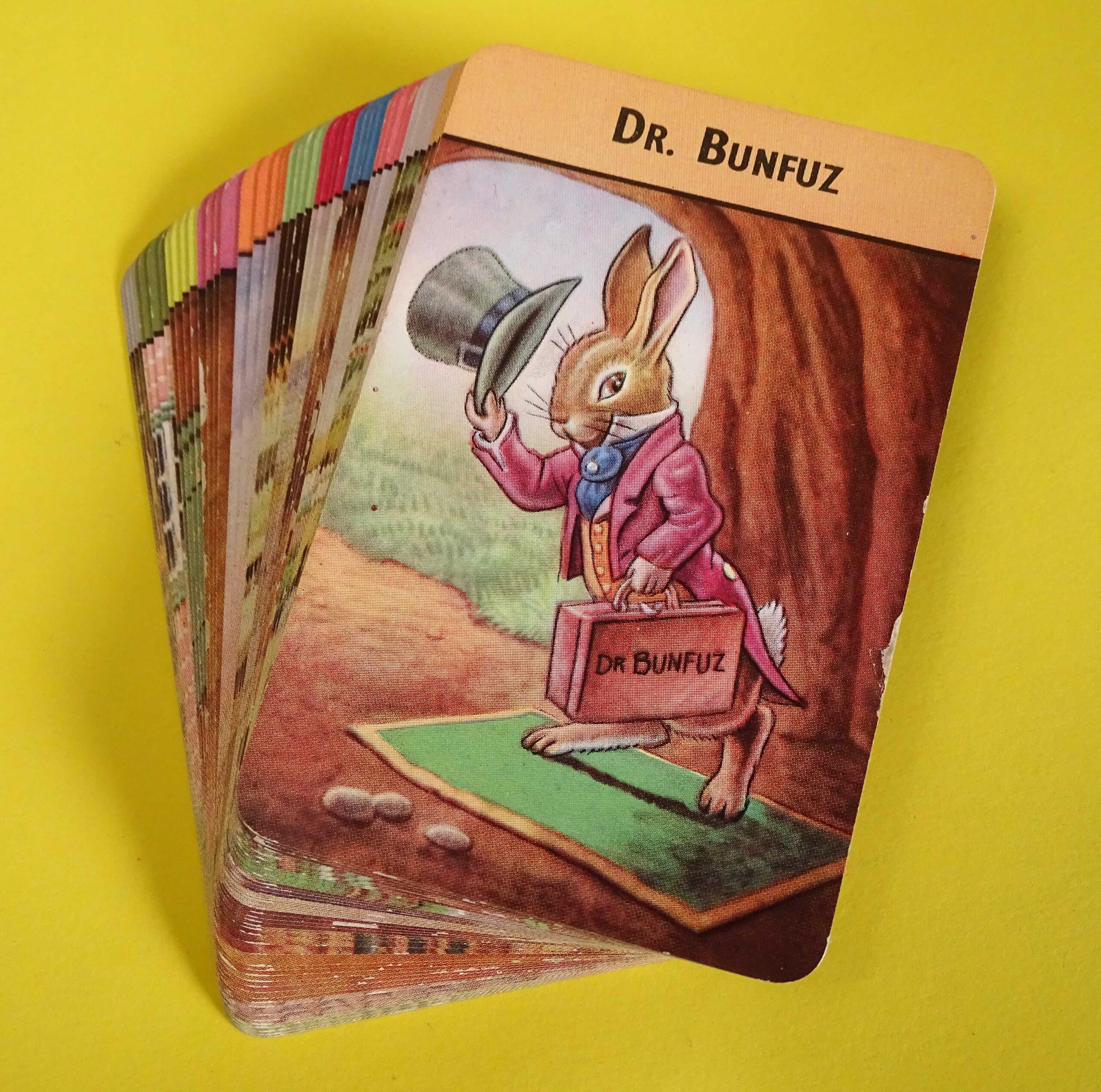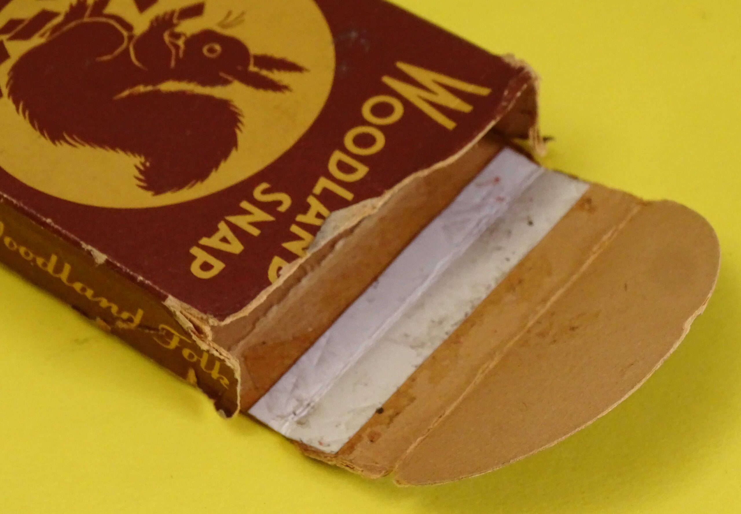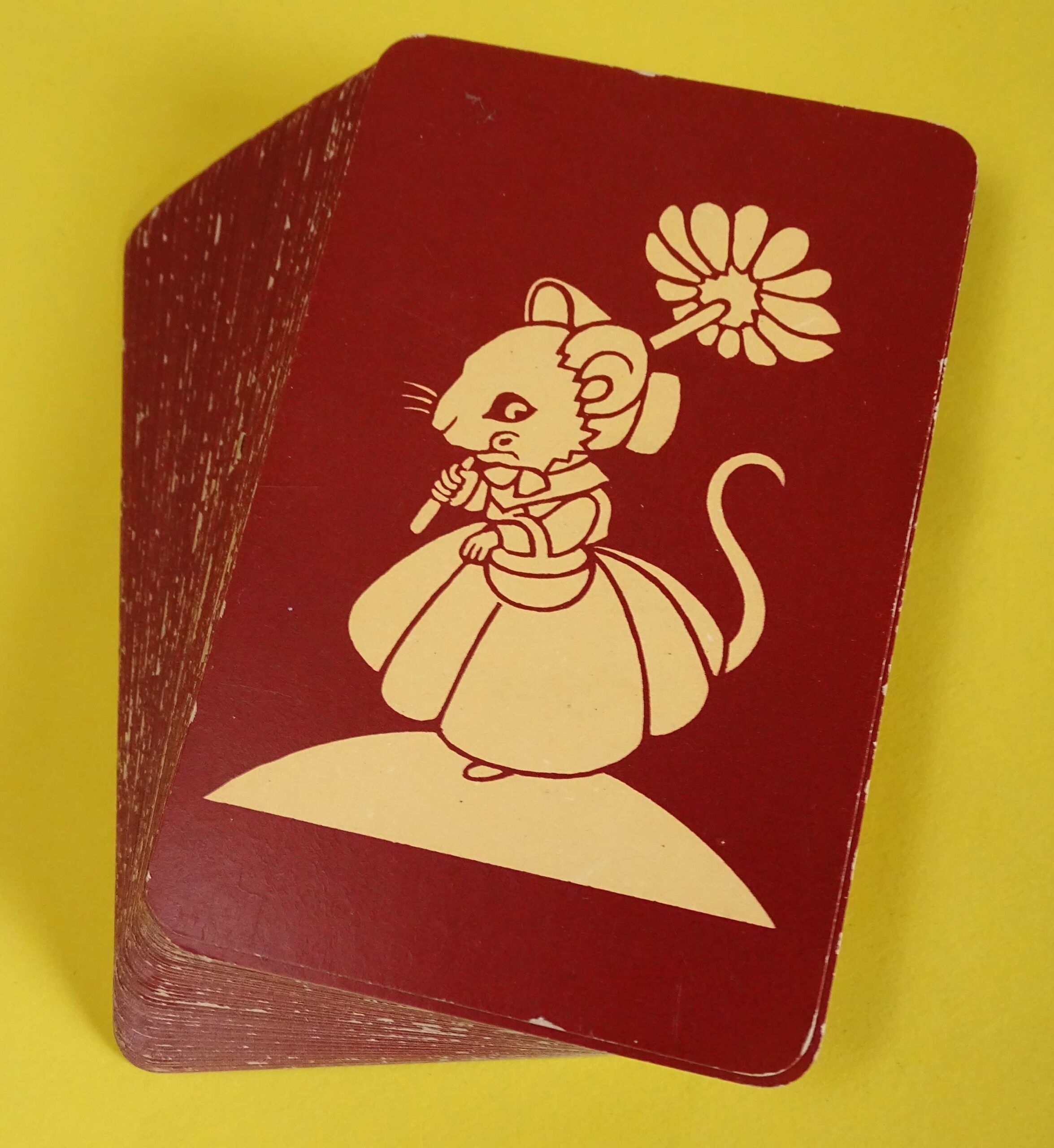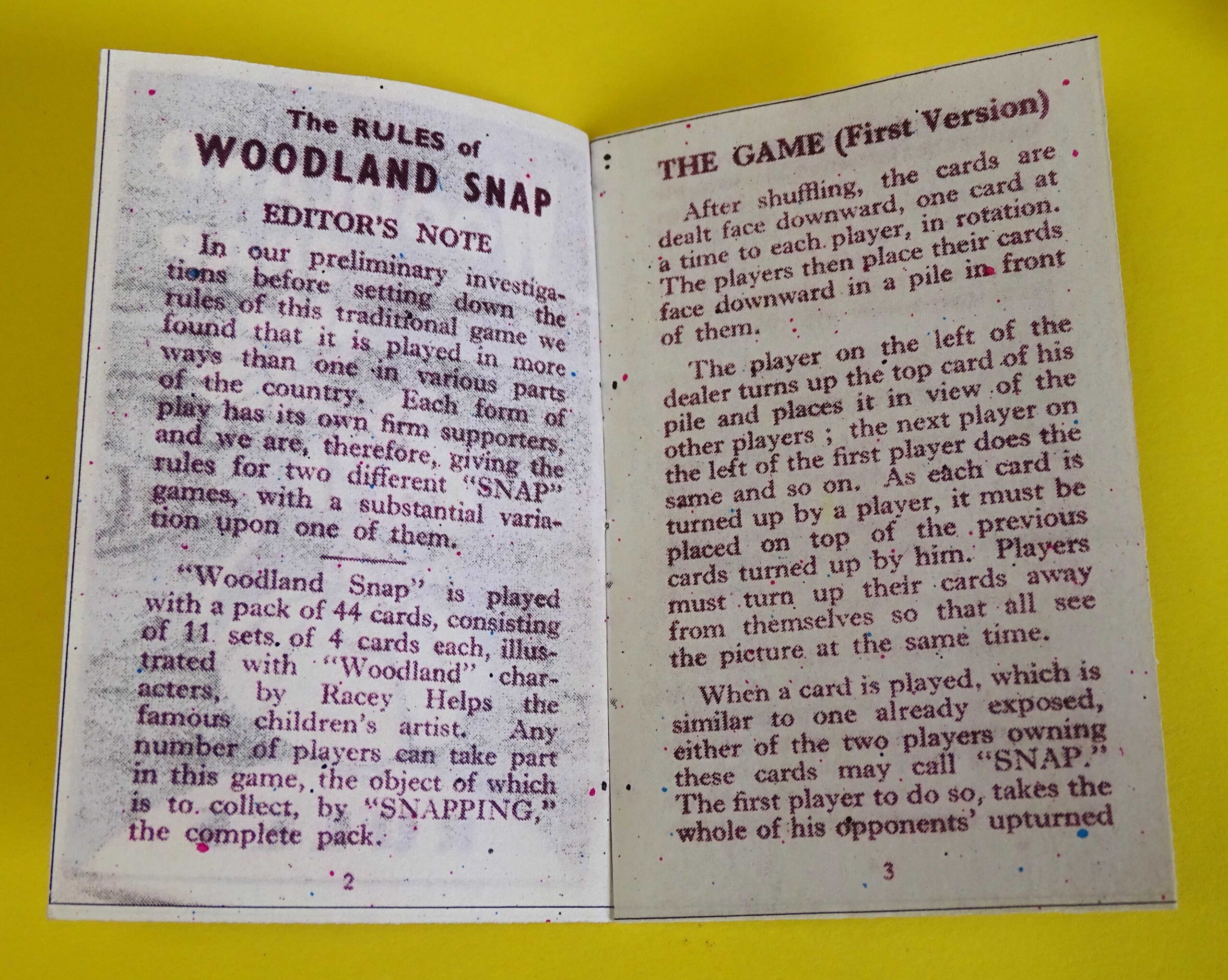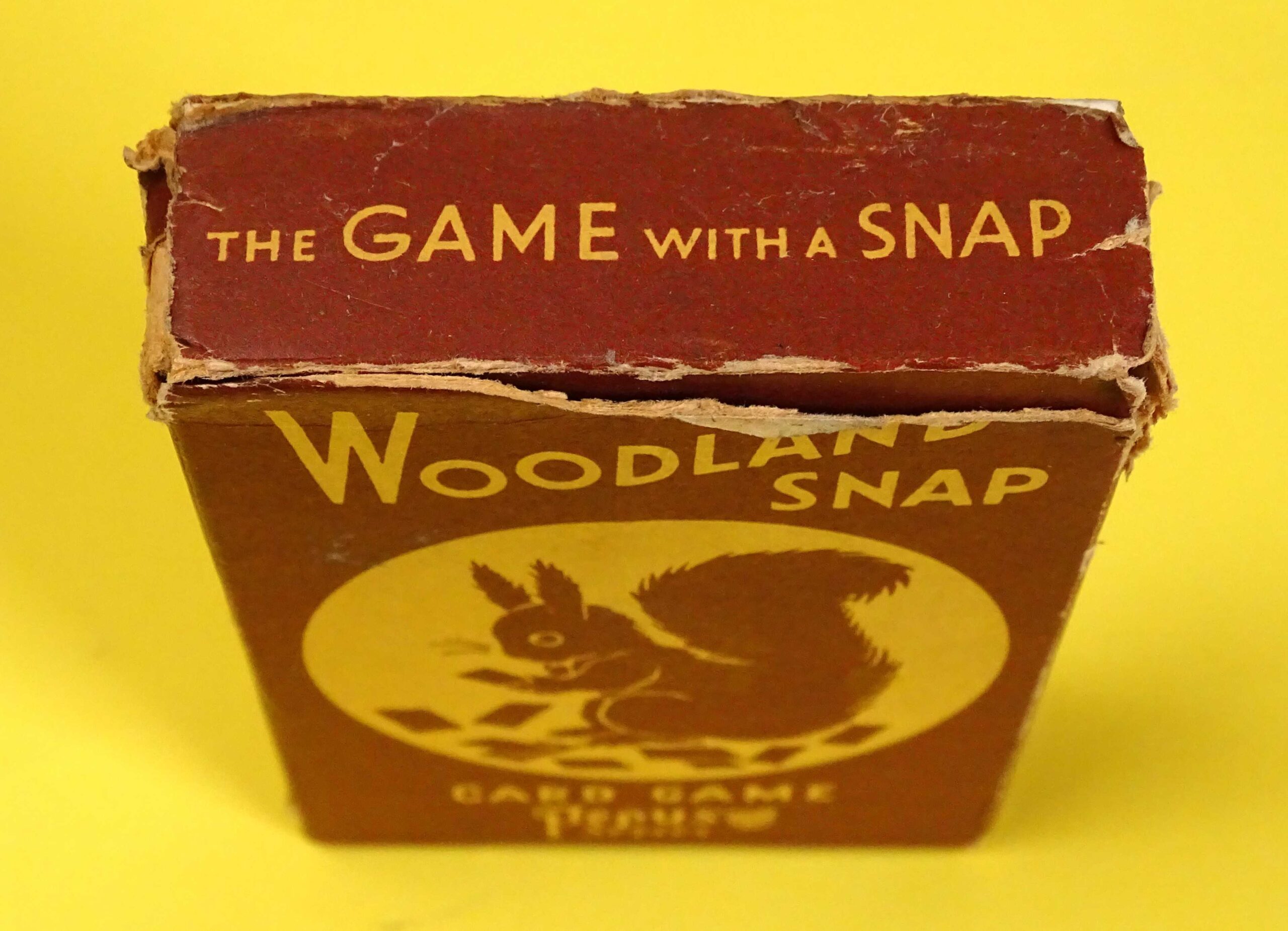 A delightful vintage card game with a full deck of cards, beautifully illustrated by Racey Helps. The box has taken a few knocks and repairs over the years but the cards are in excellent condition as shown. I have also included a copy of the Rules for completeness. Woodland Snap is a Pepys game, published by Castell Brothers of London in around 1960,