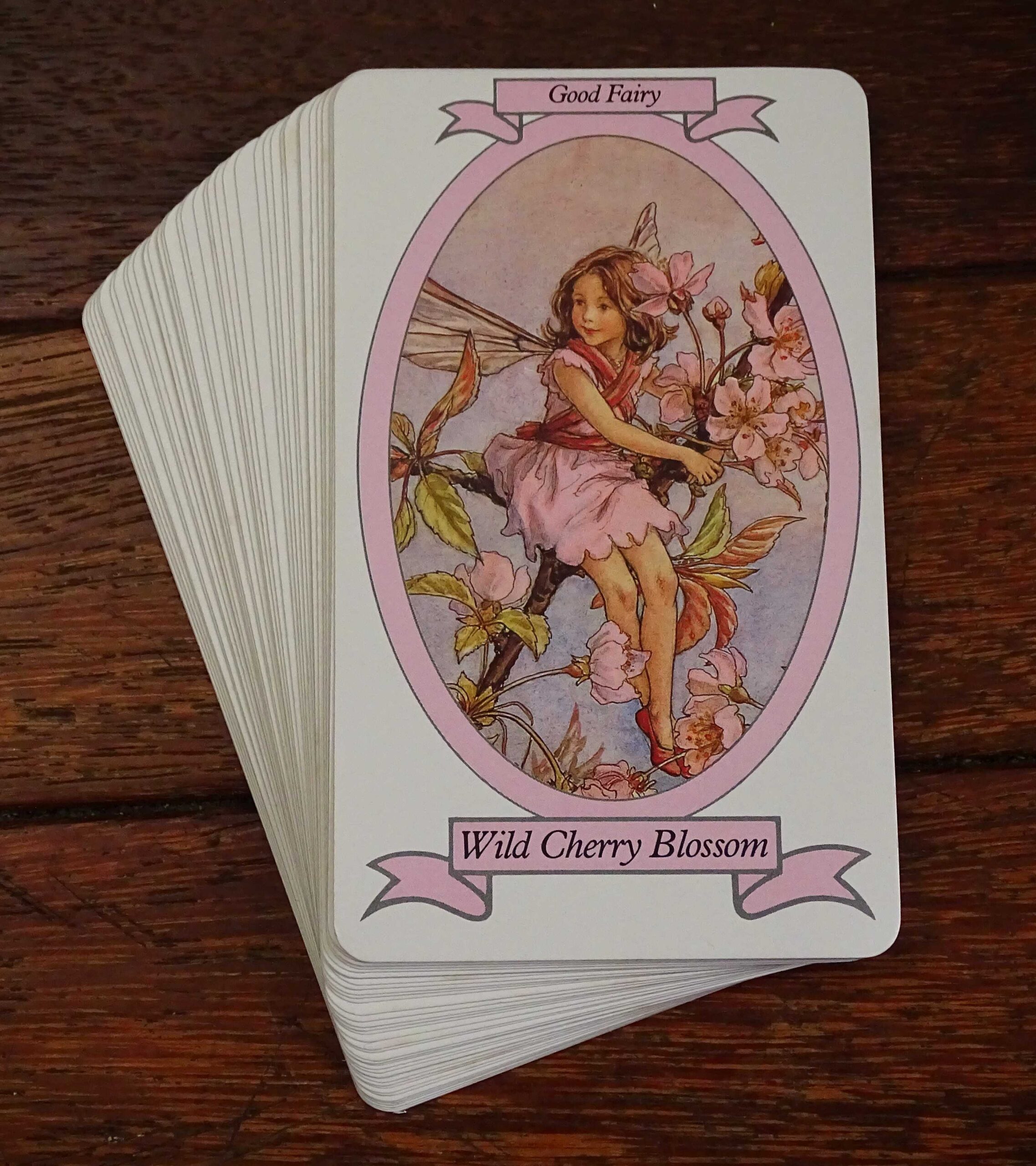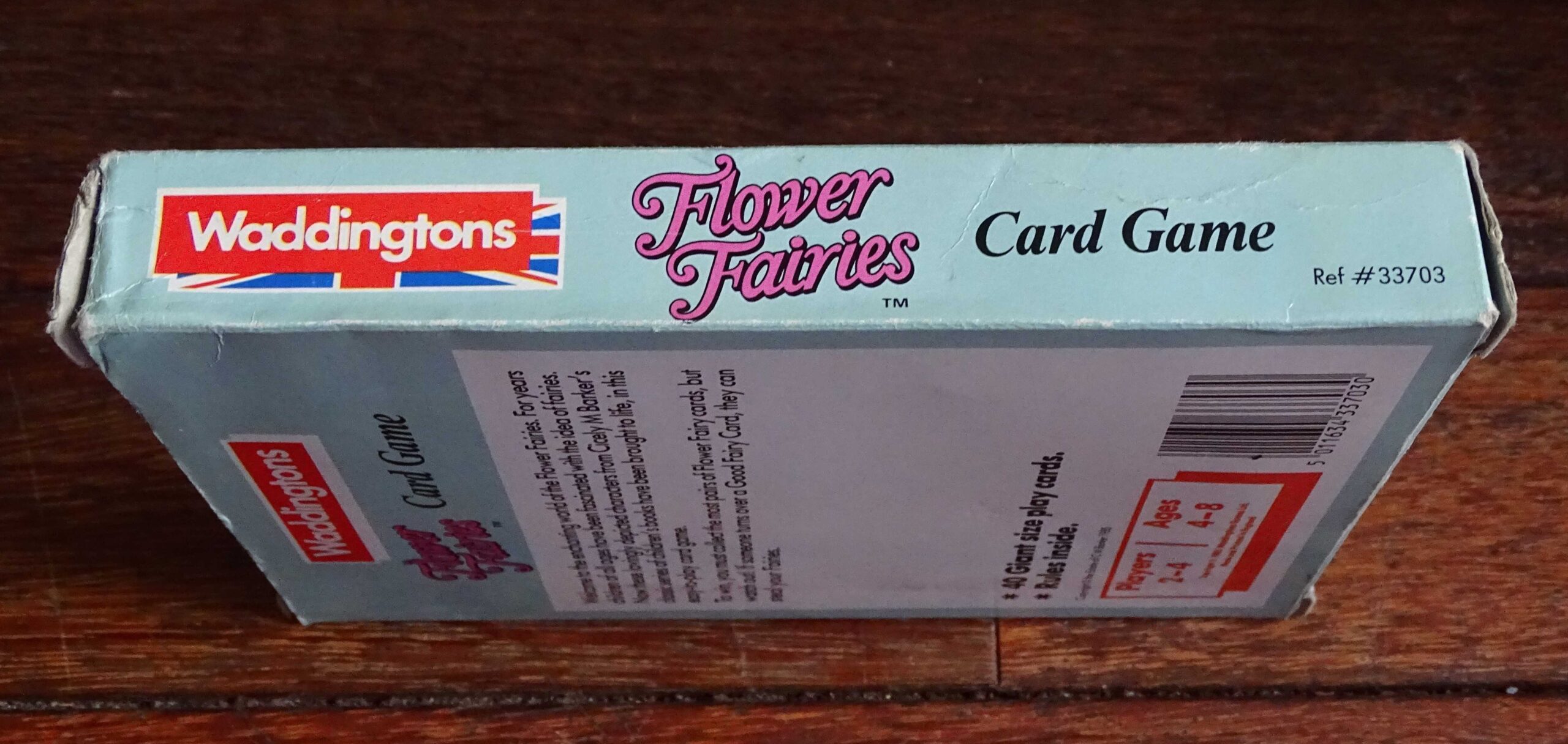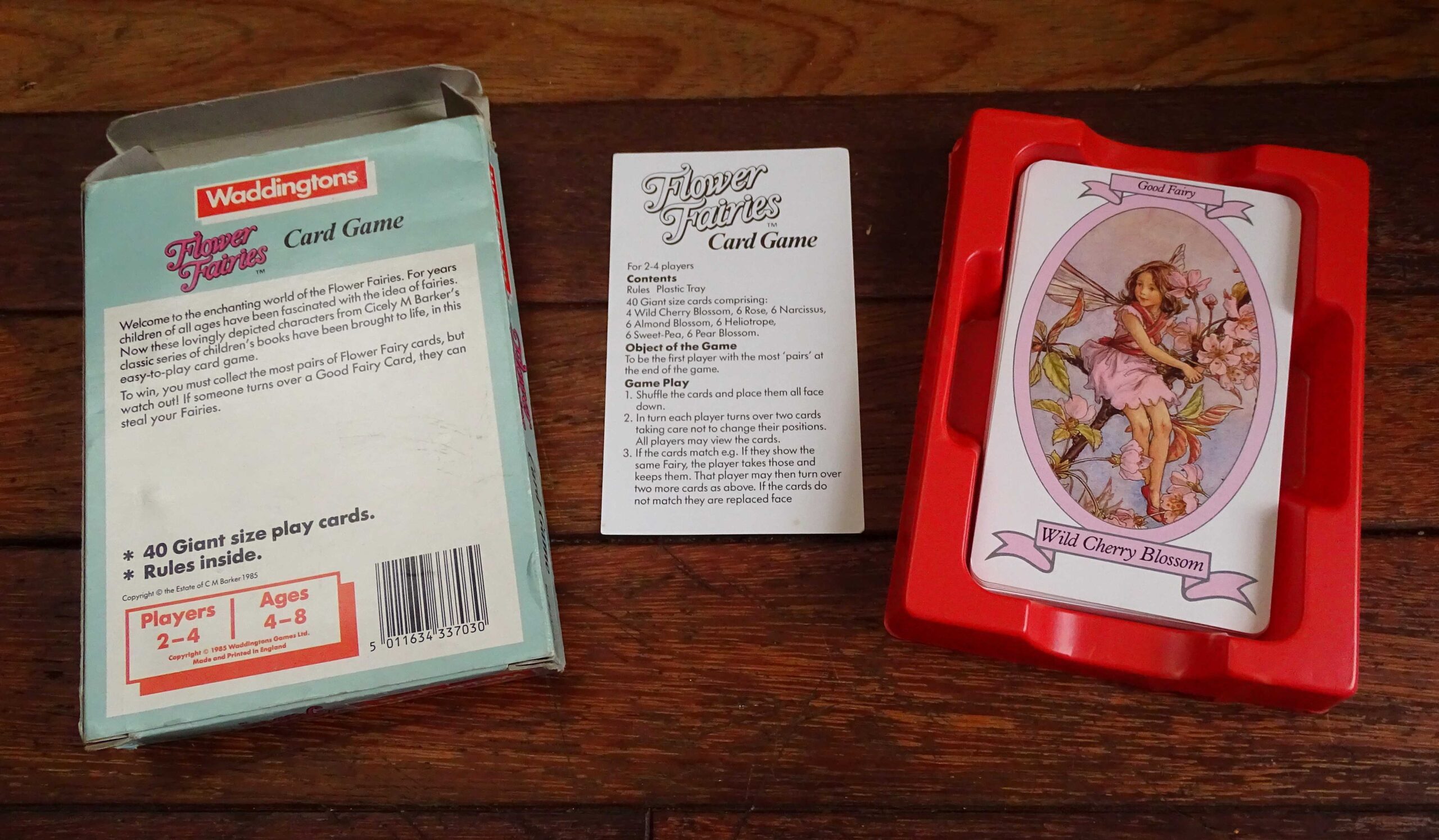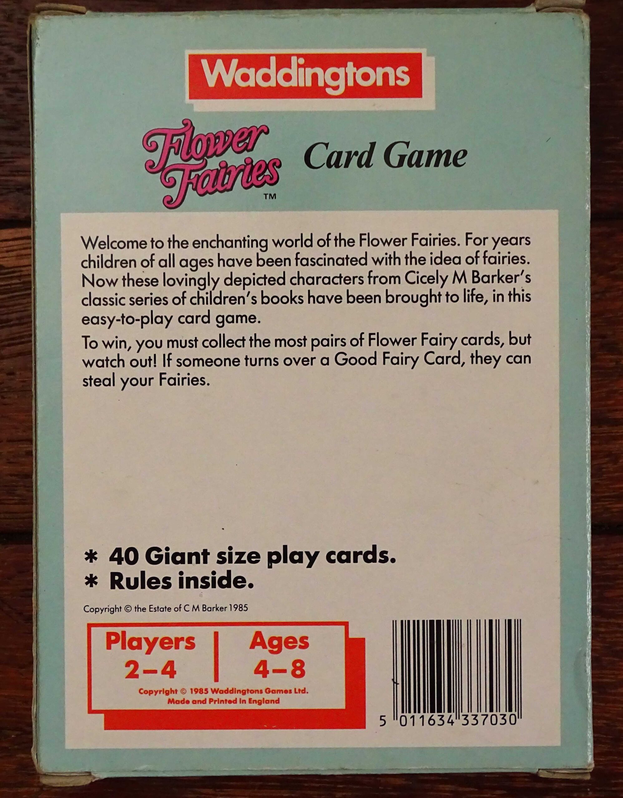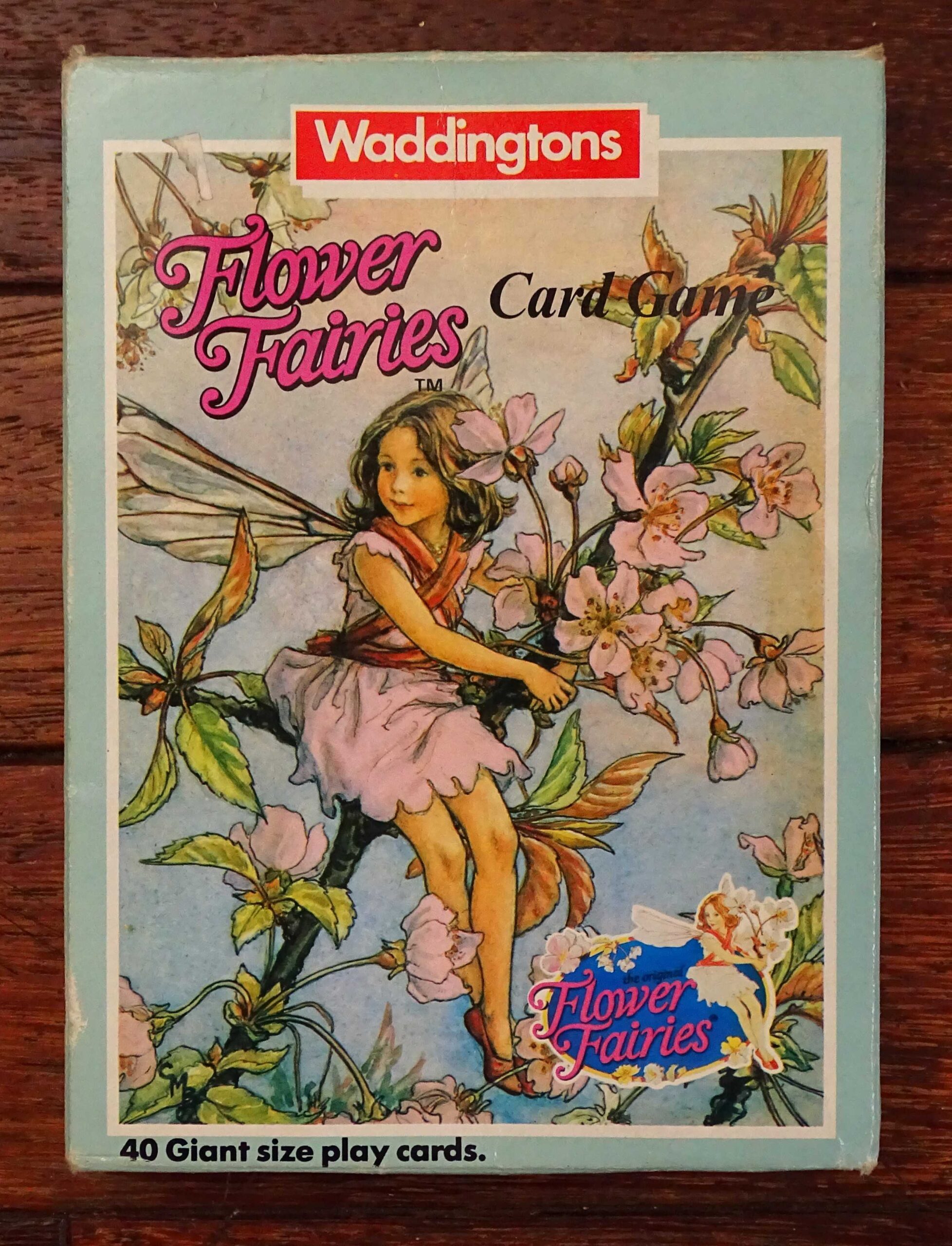 In the 1980’s, Waddingtons produced a series of card games containing 40 ‘Giant Size’ cards. This particular version, featuring Cicely M Barker’s Flower Fairies, appears to be a very rare edition. All 40 cards are present along with the original rules. As can be seen, the stunning artwork on the extra large cards remains faithful to the originals. The game was was made in England and published by Waddingtons in 1985.